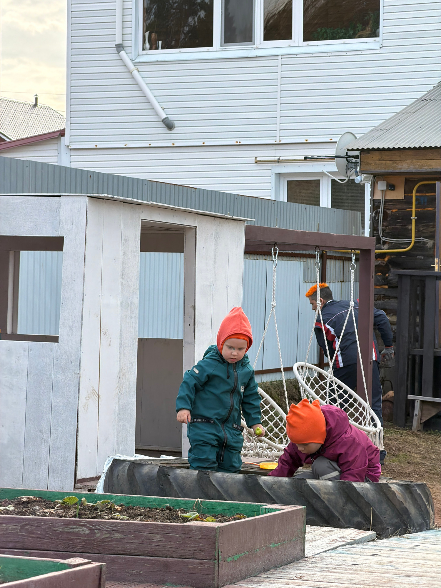 The image depicts a residential area in what is likely Chaikovsky, Russia. There's a white siding building with multiple windows and a gray corrugated roof visible on the left. Attached to this is a sā¦read more