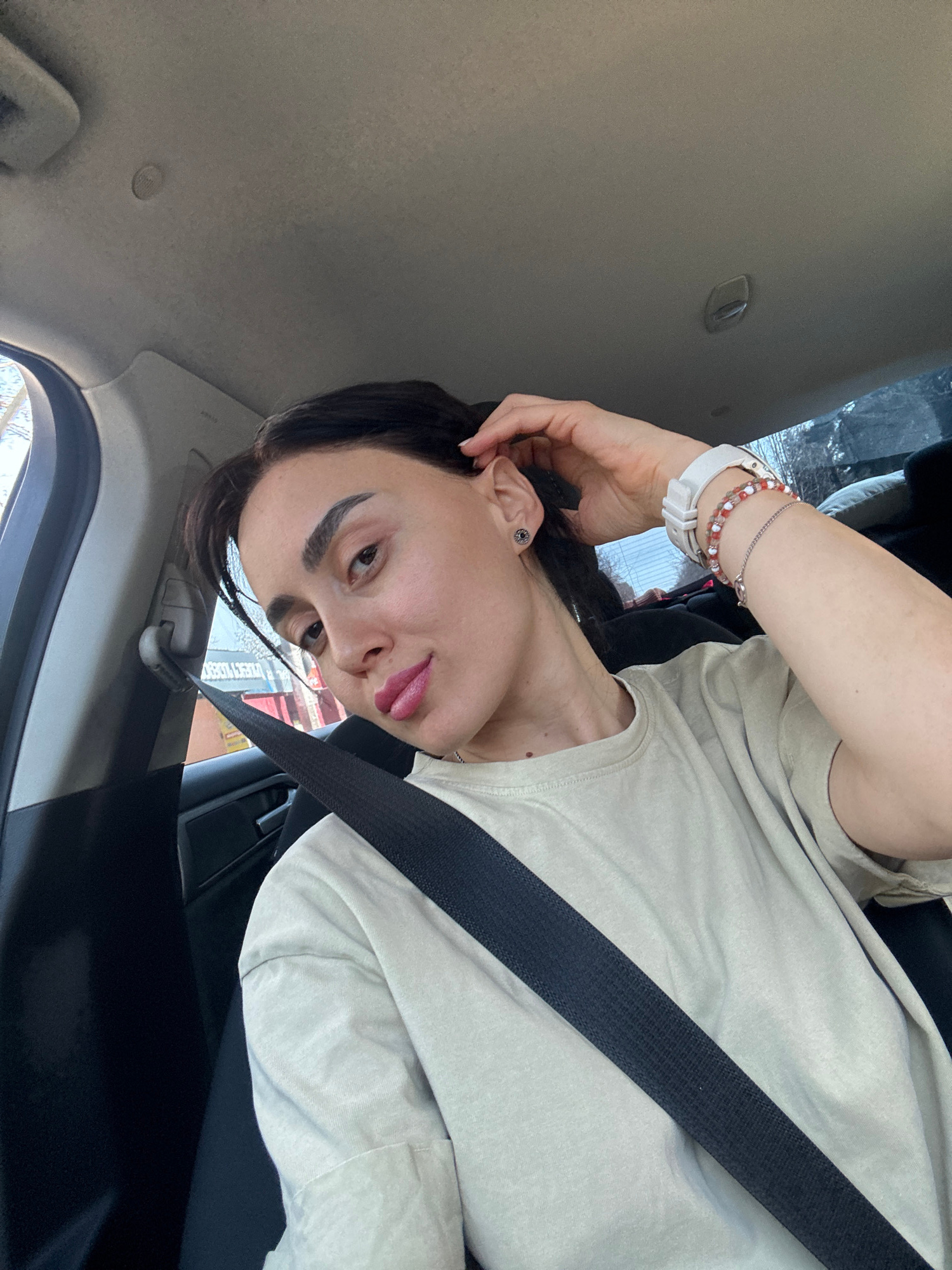 A young adult woman is inside a vehicle, wearing a seatbelt and a beige-colored t-shirt. She has dark hair and is wearing a wristwatch and bracelets. The background visible through the vehicle's windo…read more