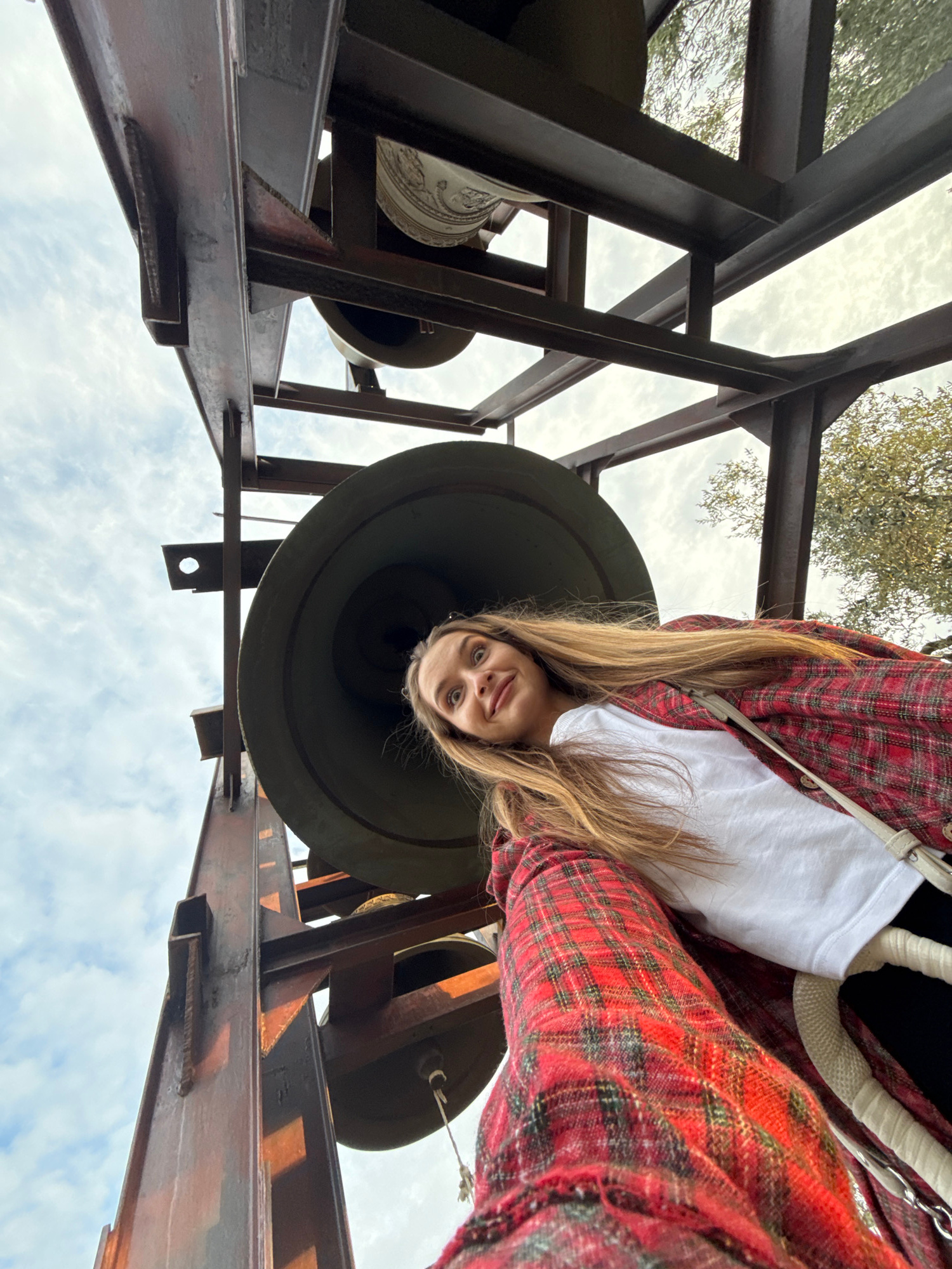 A low-angle, upside-down shot reveals a young woman positioned directly beneath a large, dark-colored bell within a metal framework. She is wearing a white shirt and a red and black plaid jacket. The…read more