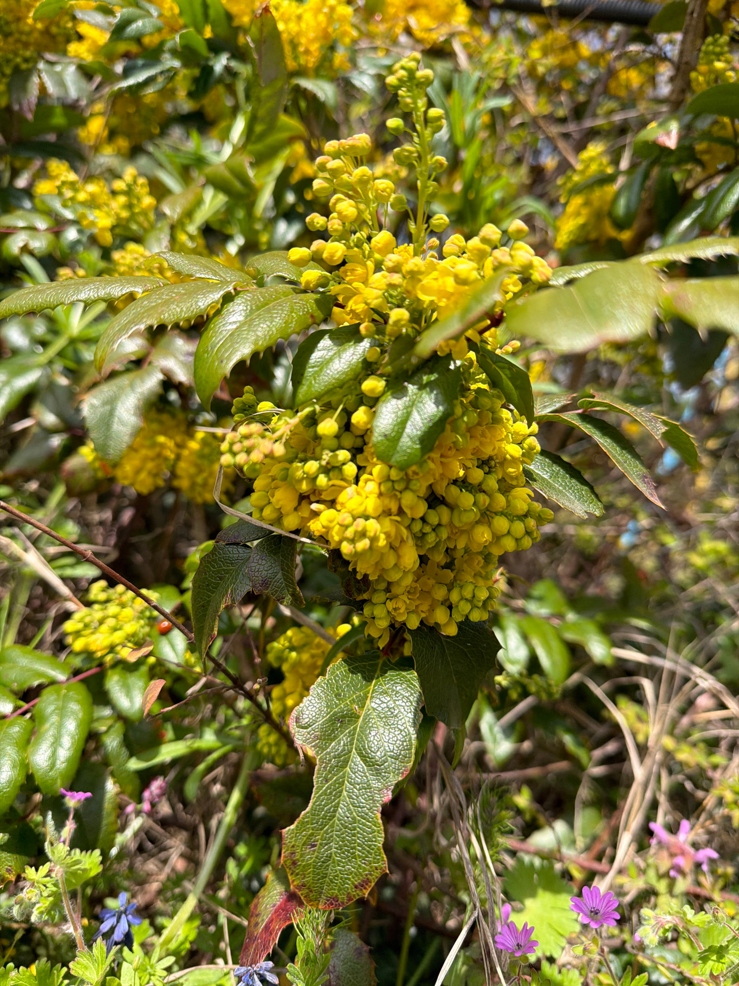 The image shows a close-up of a flowering Oregon grape plant. The plant has clusters of small, yellow flowers and spiky green leaves. Some smaller purple flowers are also visible in the background, wh…read more
