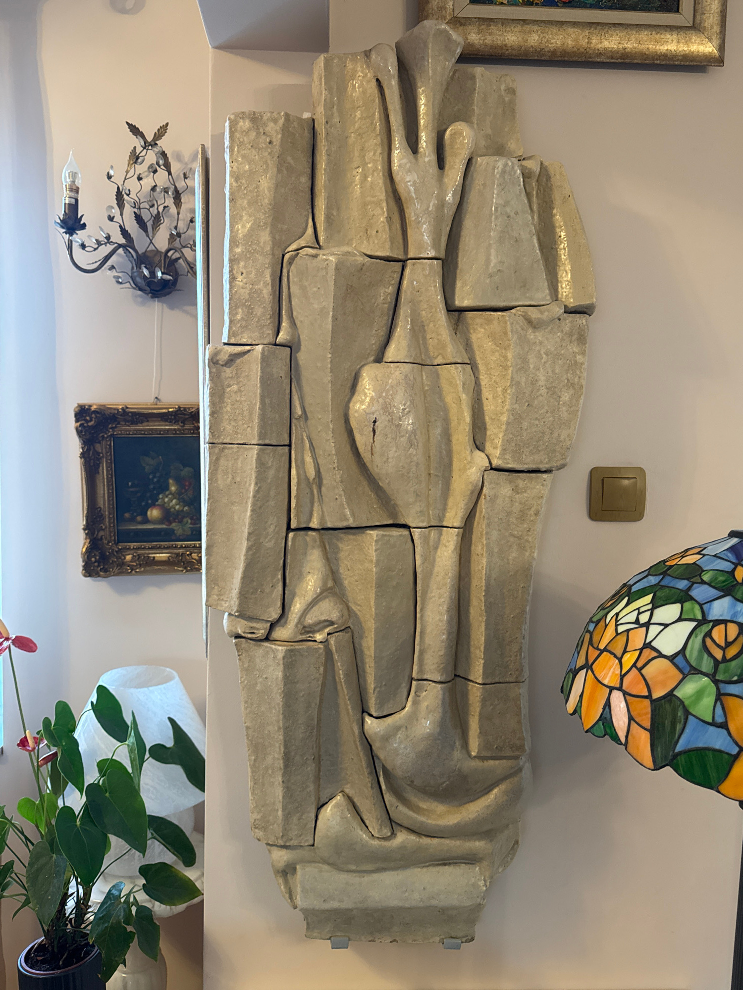 A horizontally oriented medium shot shows a light gray sculpted stone art piece, possibly depicting a reclining figure, mounted on a beige-colored wall. The sculpture is composed of multiple stone blo…read more