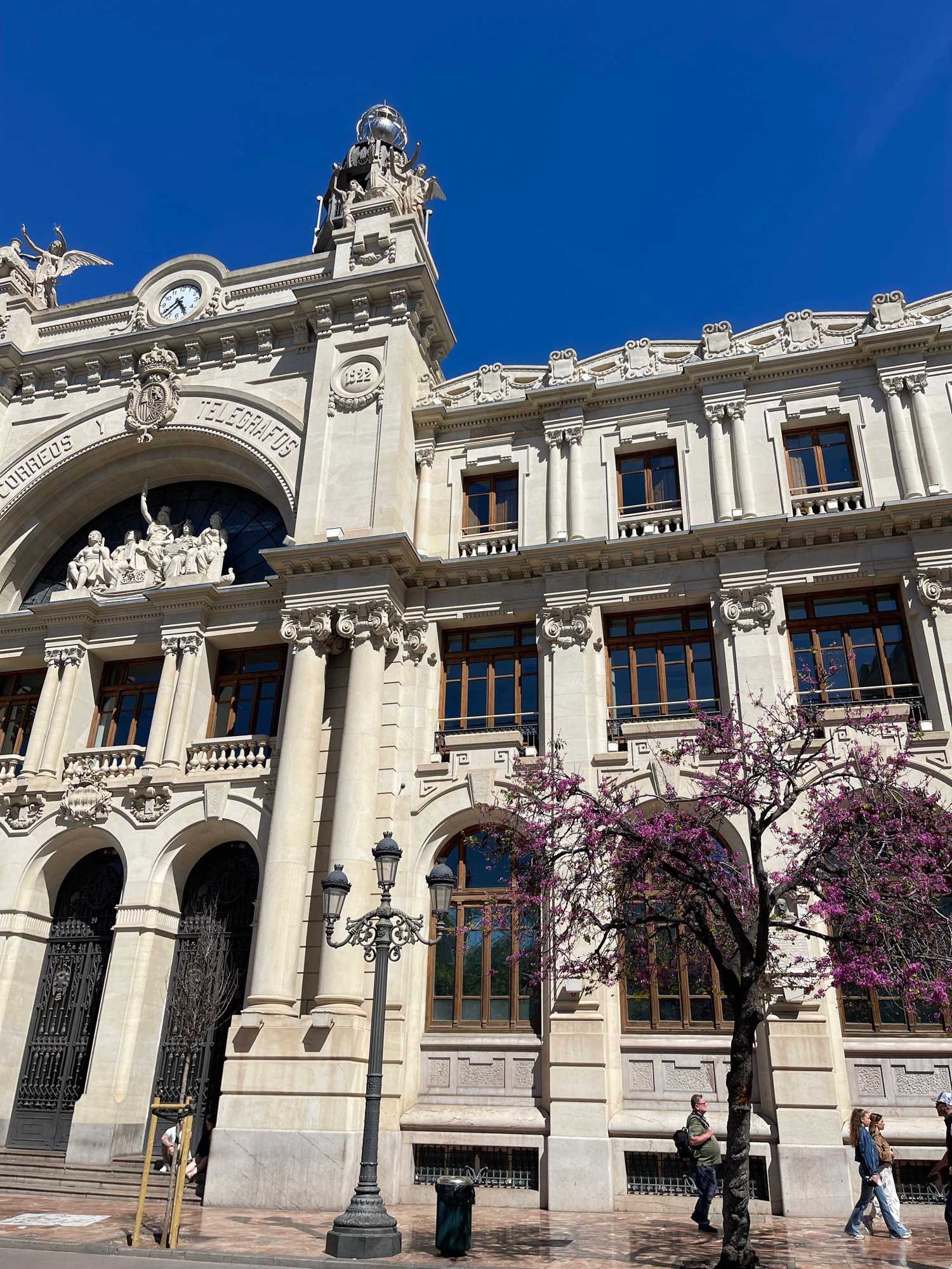 The image shows the façade of the Correos y Telégrafos building in València, Spain, with a clear blue sky in the background. The building is a light-colored stone structure with ornate architectural d…read more