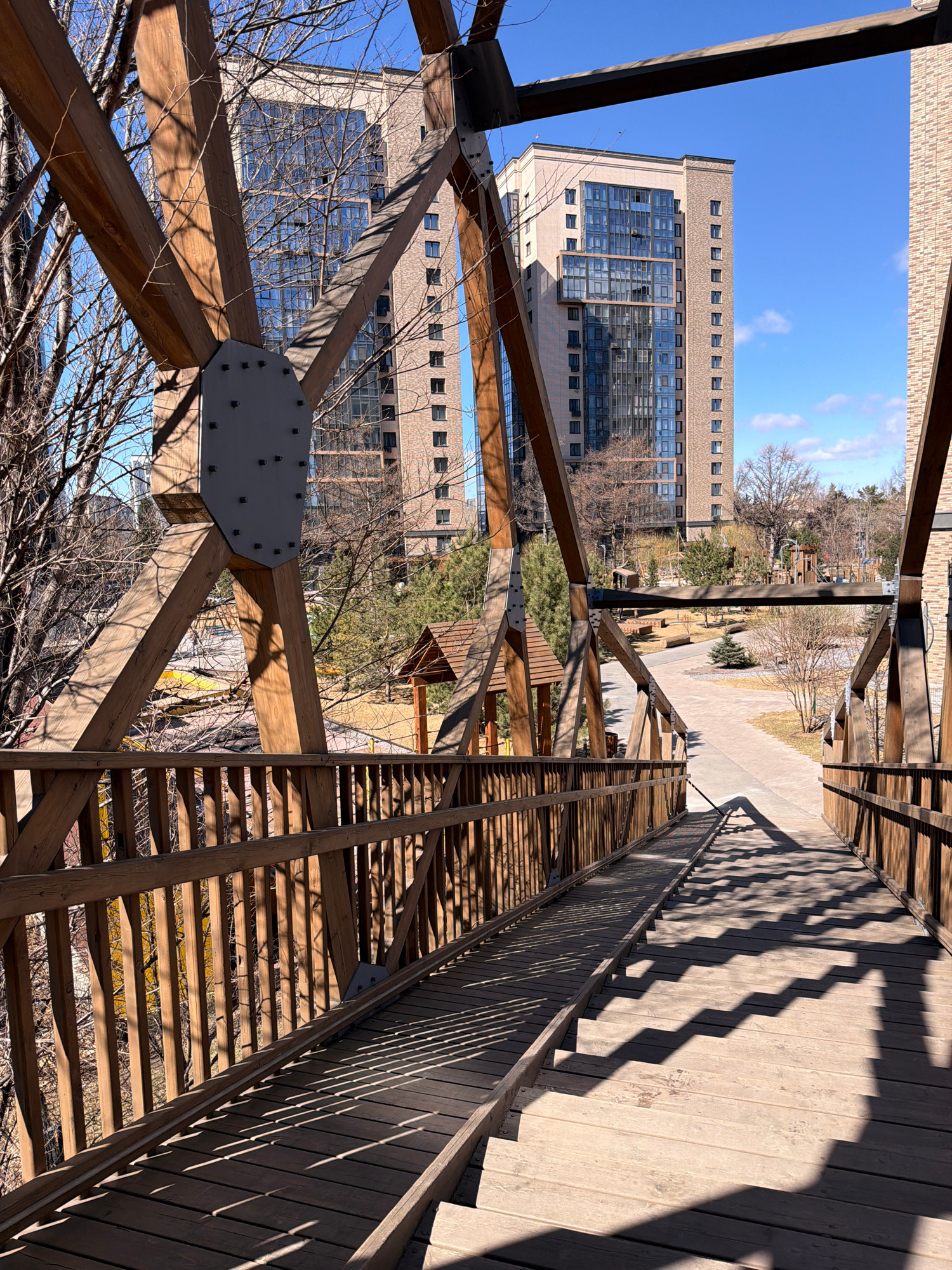 The image depicts a pedestrian bridge in Krasnoyarsk, Russia, offering a view towards a building. The bridge is constructed of wood and steel, with visible support beams and a bolted metal plate. Sunl…read more