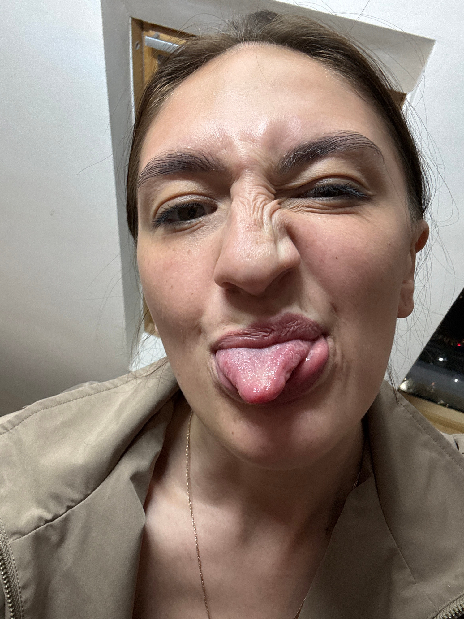 A close-up, angled shot depicts a woman making a face with her tongue sticking out. Her eyes are squinted, and her nose is crinkled. She appears to be wearing a jacket. A gold chain is visible around…read more