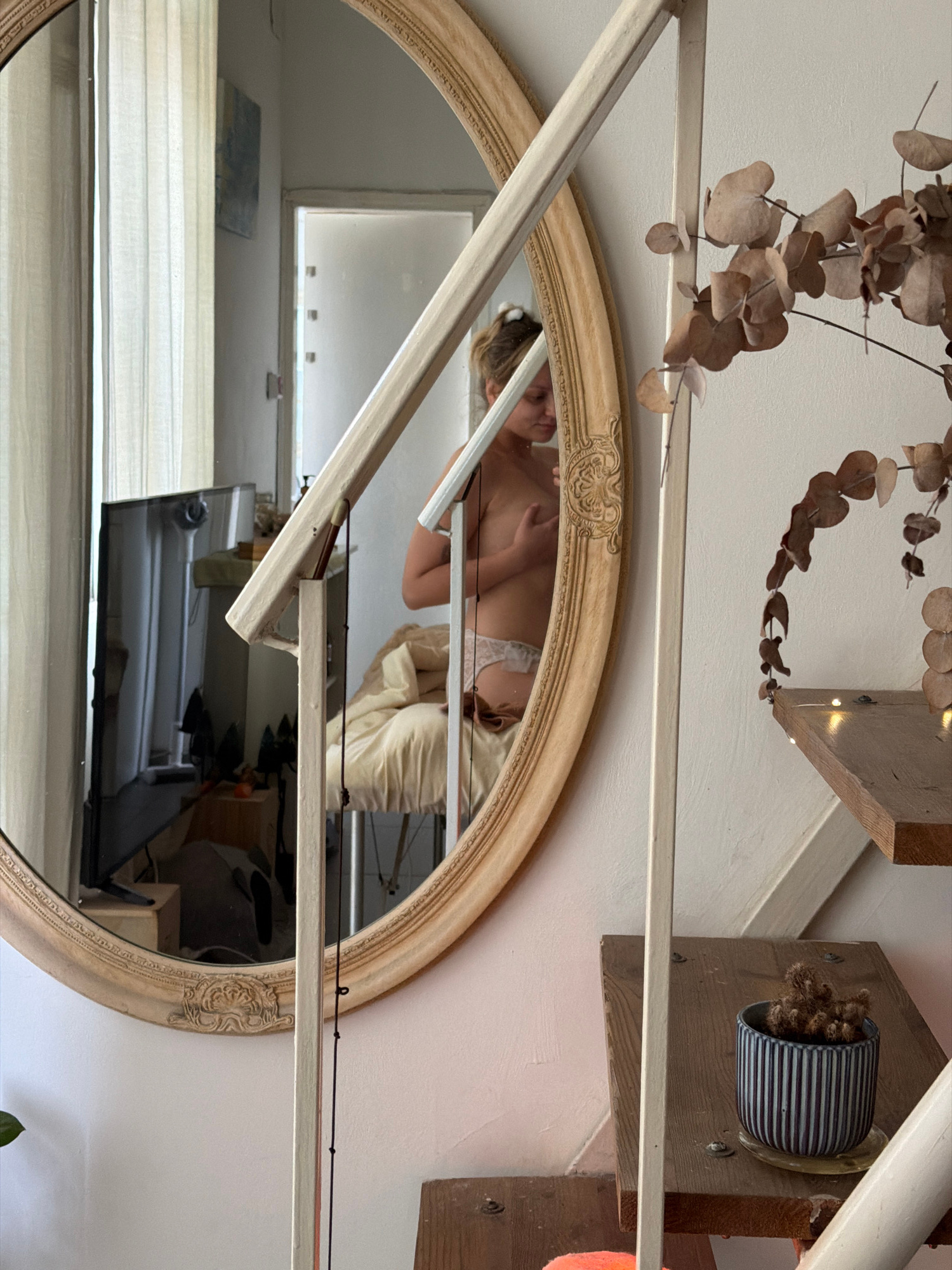 The scene depicts an interior view reflected in an oval mirror with a decorative, light-colored frame. The reflection shows a woman wearing a white bra and a light-colored robe or blanket. Her reflect…read more