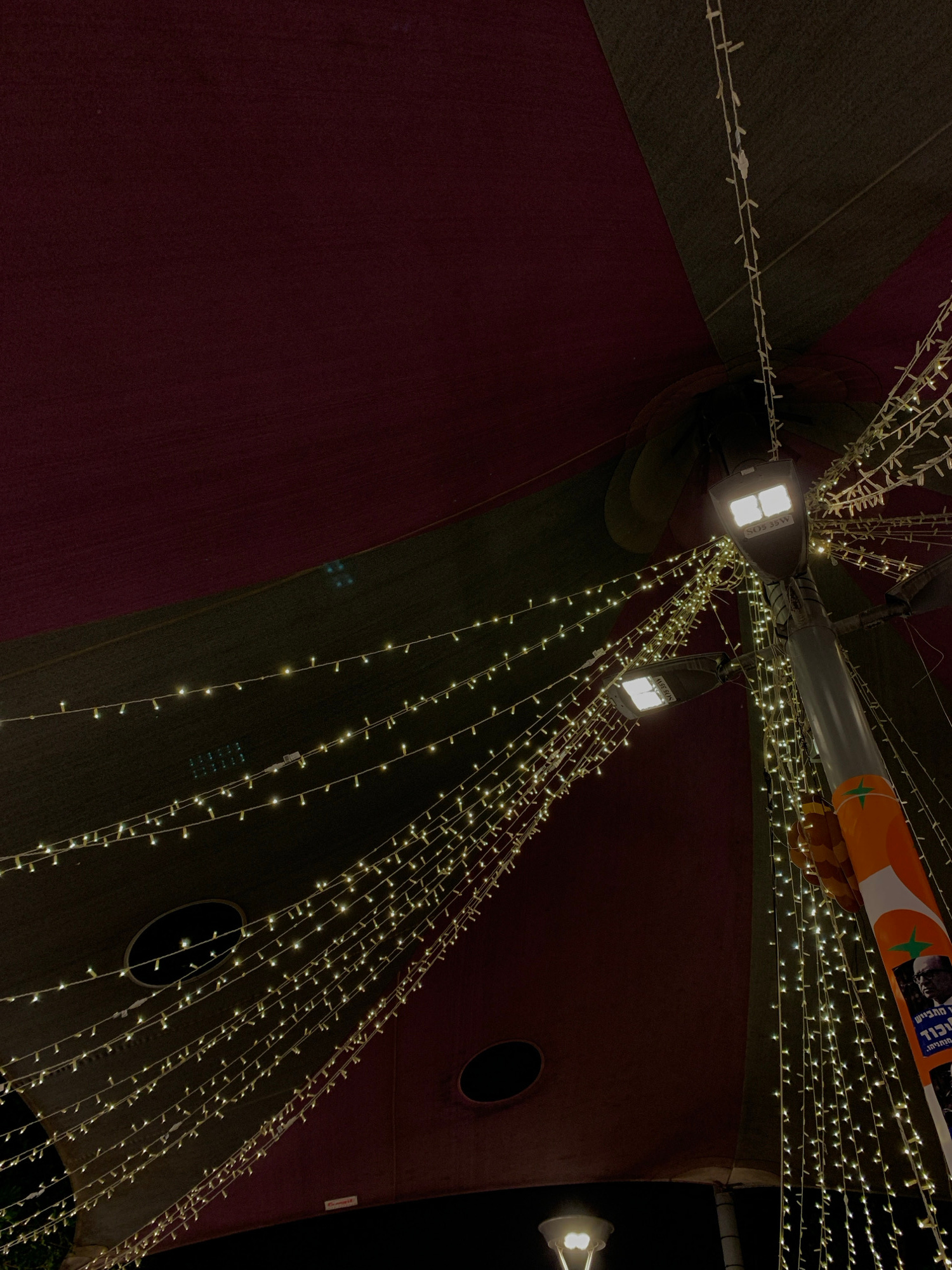 Captured from a low-angle perspective, the image showcases an outdoor structure draped with festive lights. The structure is segmented into dark red and dark green portions. A large, orange and white…read more