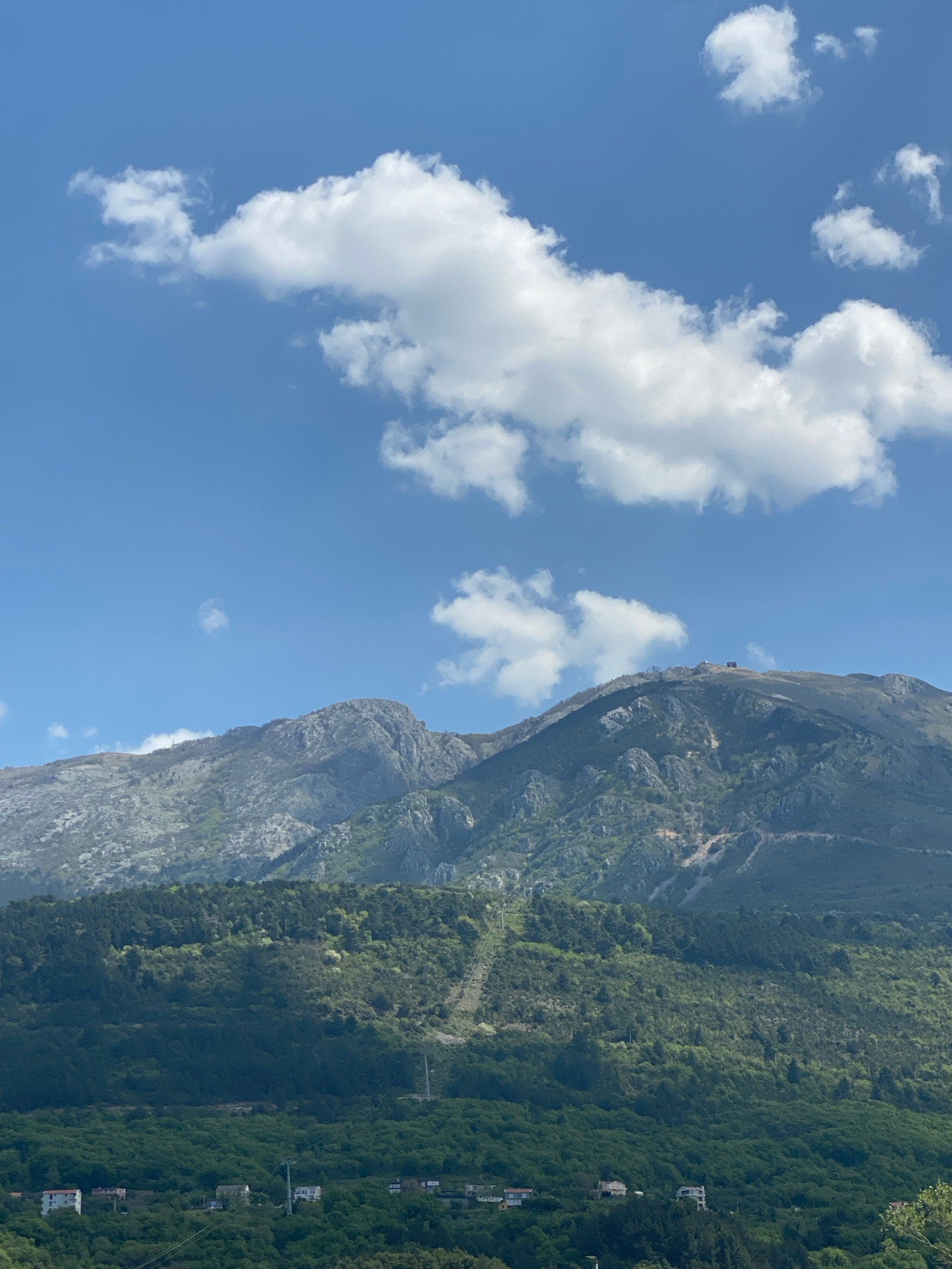 The image captures a vast landscape featuring a towering mountain, lush vegetation, and a clear blue sky with white clouds. The perspective is tilted, making the mountain appear on the right side, ris…read more