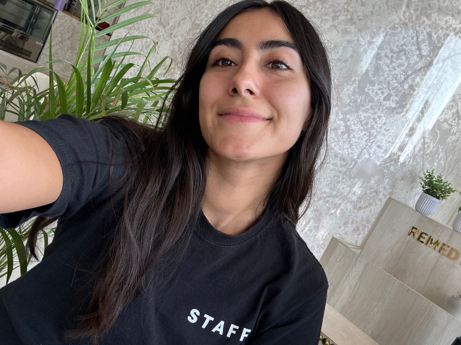 An eye-level selfie shows a young adult woman with long, dark hair, dark eyes, and a light complexion, looking up towards the camera with a subtle smile. She is wearing a black t-shirt with the word "…read more