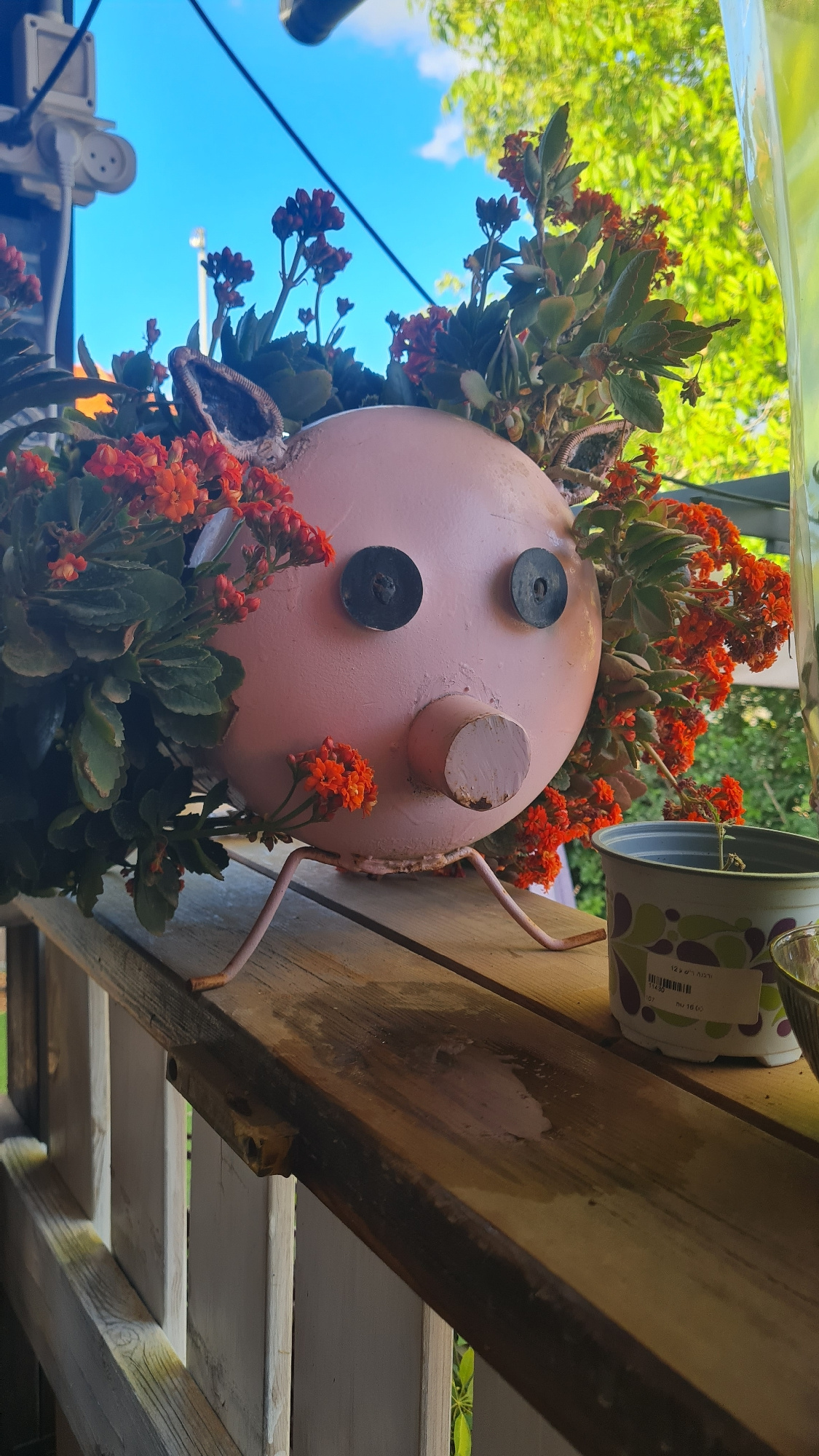 A pink, round object, likely a repurposed metal sphere, is adorned with various plants, including succulents with orange flowers. This structure is attached to a wooden beam, possibly part of a pergol…read more