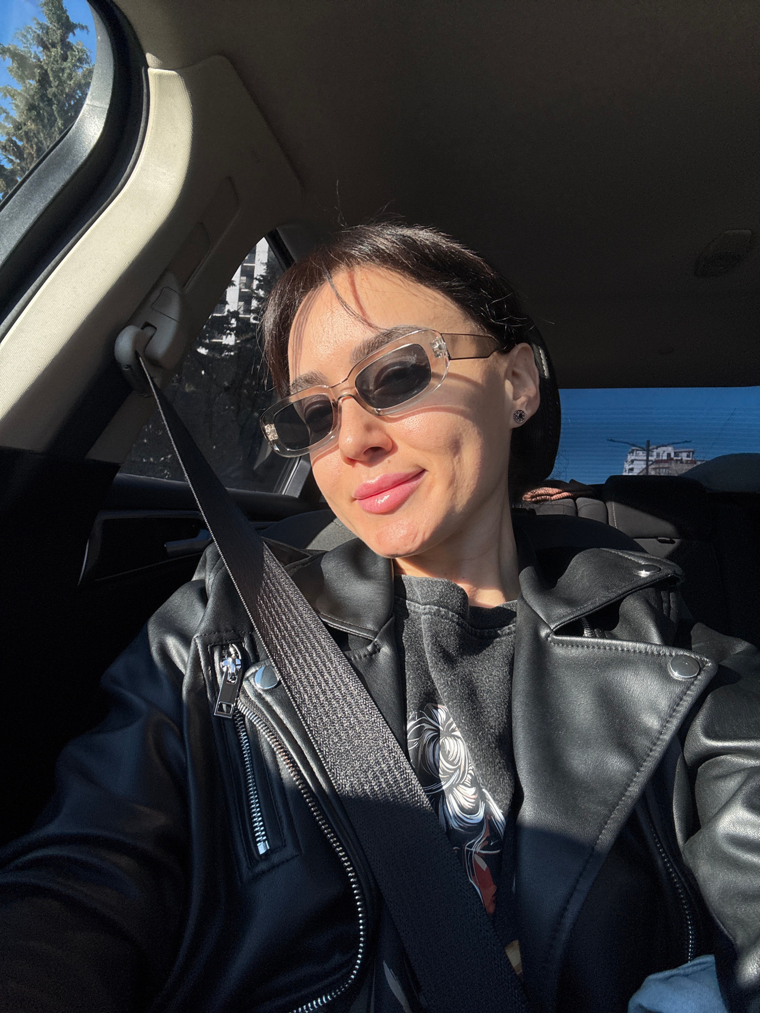 The image is a selfie taken inside a car. A woman wearing sunglasses and a black leather jacket is wearing a seatbelt. Outside the car window, there is a view of some buildings and greenery. While the…read more