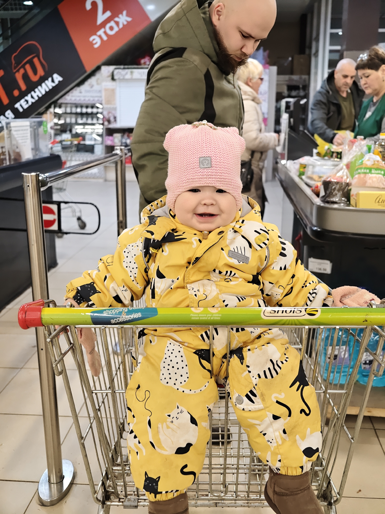 A young child wearing a yellow jumpsuit with a pattern of cats, a pink knit hat, and brown shoes, sits in a shopping cart. The child is smiling. A bald man with a beard, possibly the child's father, i…read more