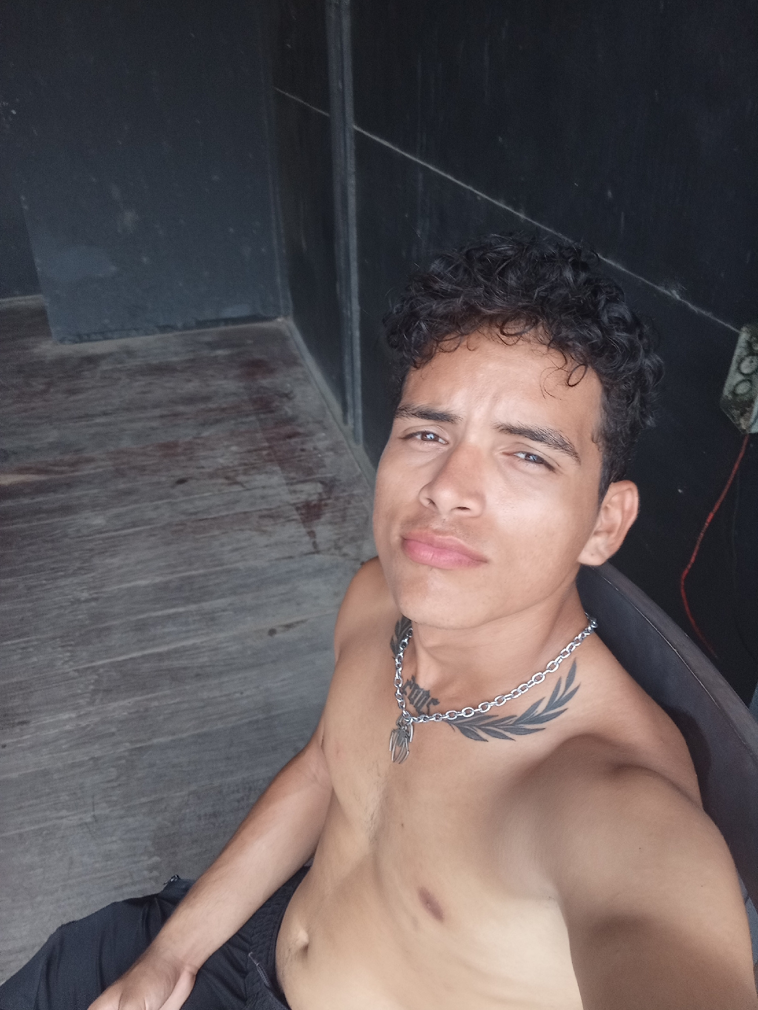 A shirtless young man with dark curly hair, a silver chain necklace, and a chest tattoo sits in a chair indoors. He is looking directly at the camera. The background consists of dark wooden flooring a…read more