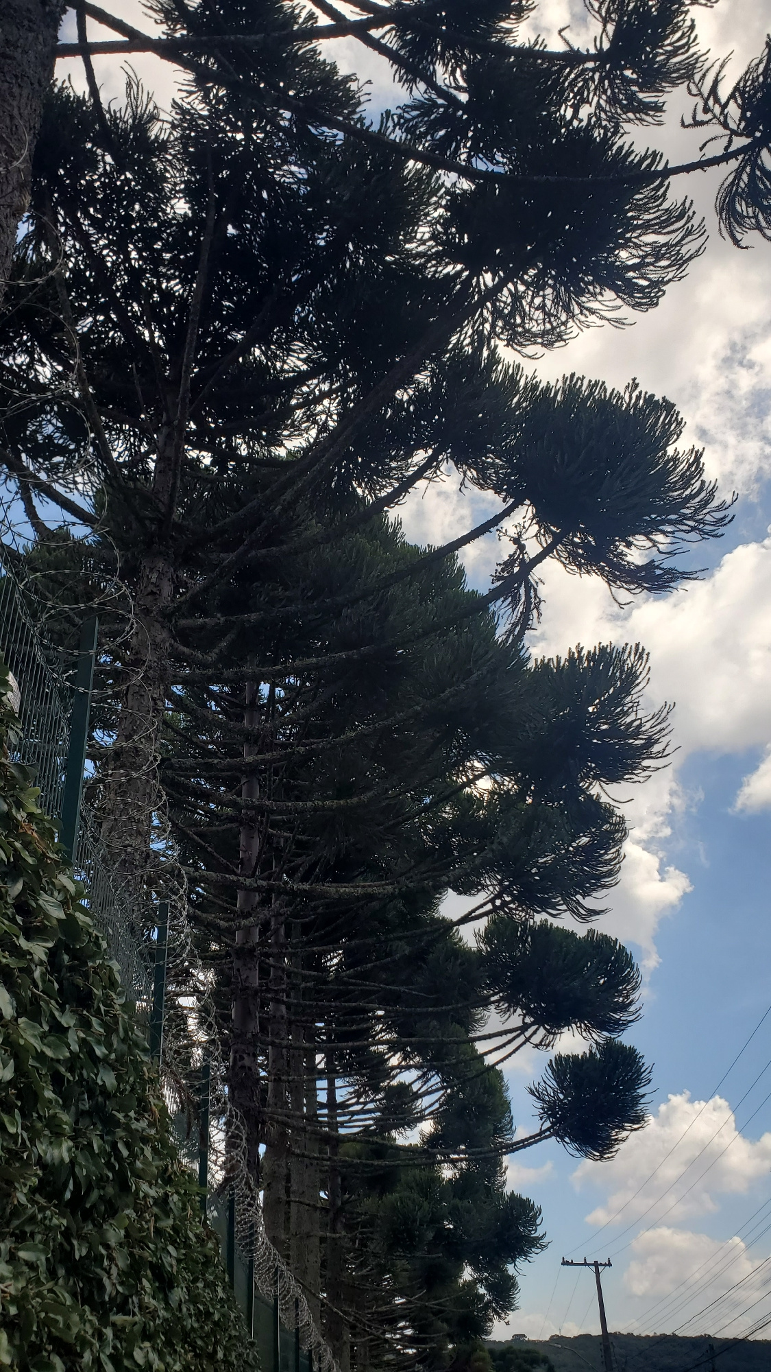 The image captures a row of Araucaria trees, distinctive to the southern Brazilian landscape, seemingly located in the city of Curitiba, Brazil. The trees are tall and thin, with umbrella-shaped canop…read more