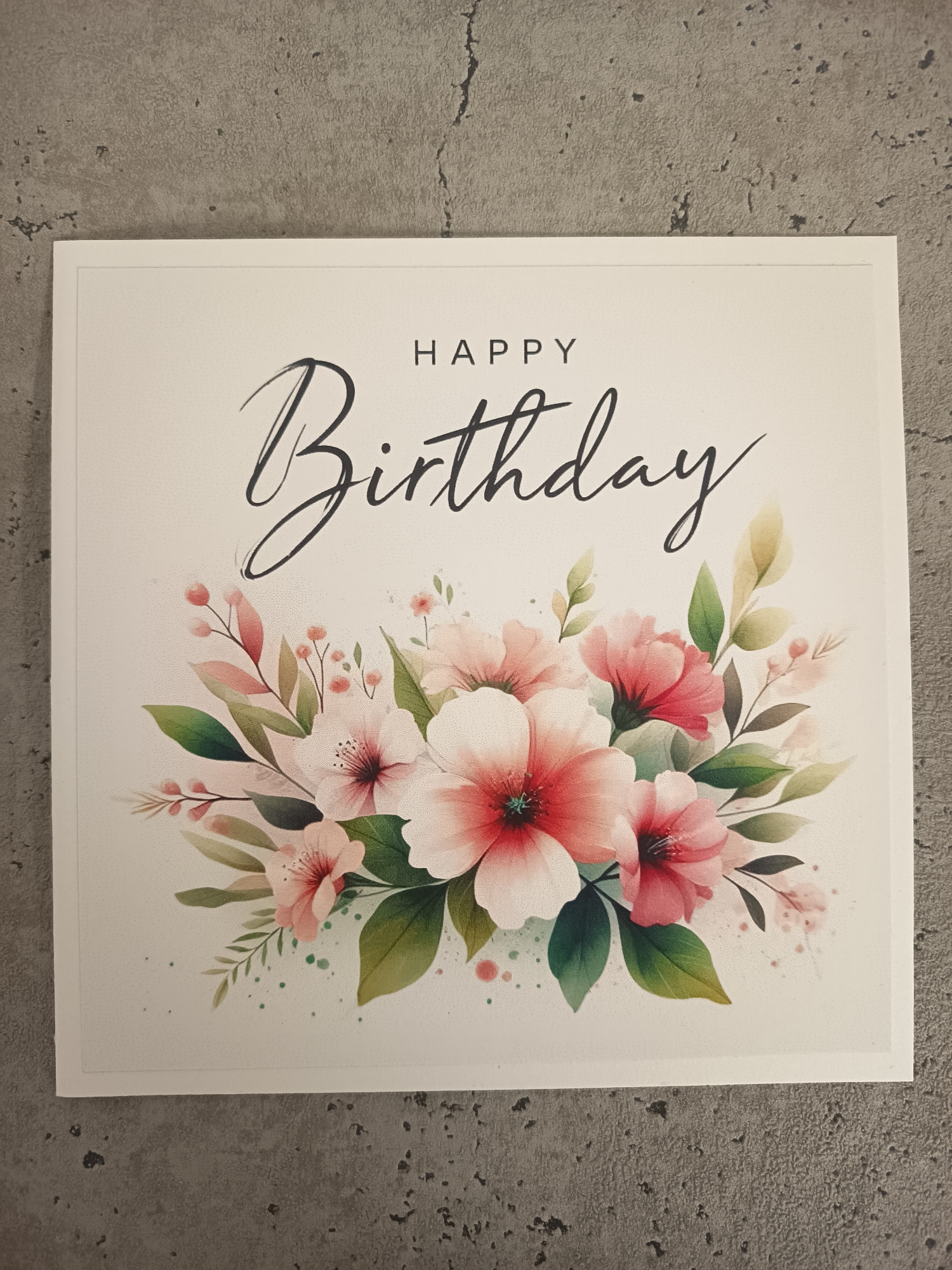The image shows a "Happy Birthday" greeting card resting on a gray, textured surface. The card is square and has a white background with a border. The words "Happy Birthday" are printed in black font…read more