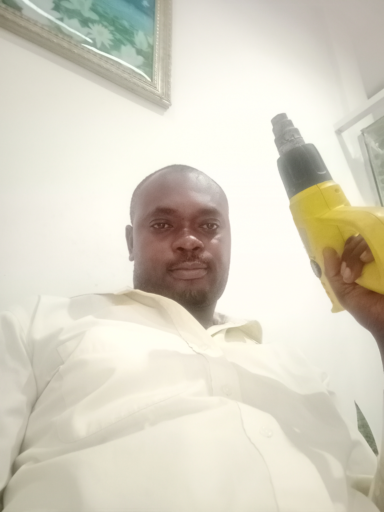 A man with dark skin holds a yellow heat gun in his right hand, pointing it upwards. He wears a white button-down shirt. Behind him is a white wall with a framed picture hanging in the upper left corn…read more