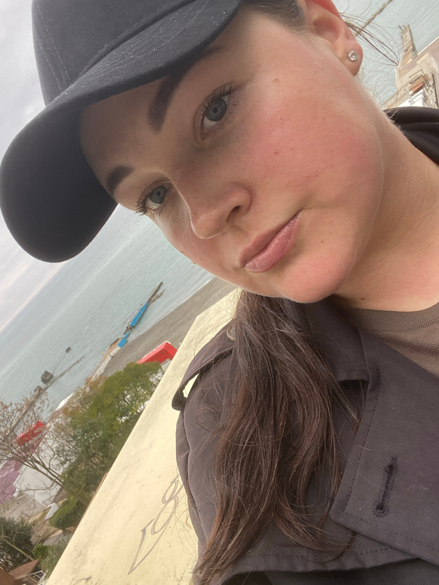 A woman wearing a black baseball cap and a dark jacket is taking a selfie outdoors. She has fair skin, dark eyebrows, and light-colored eyes. She also has a small earring in her left ear. Her hair is…read more