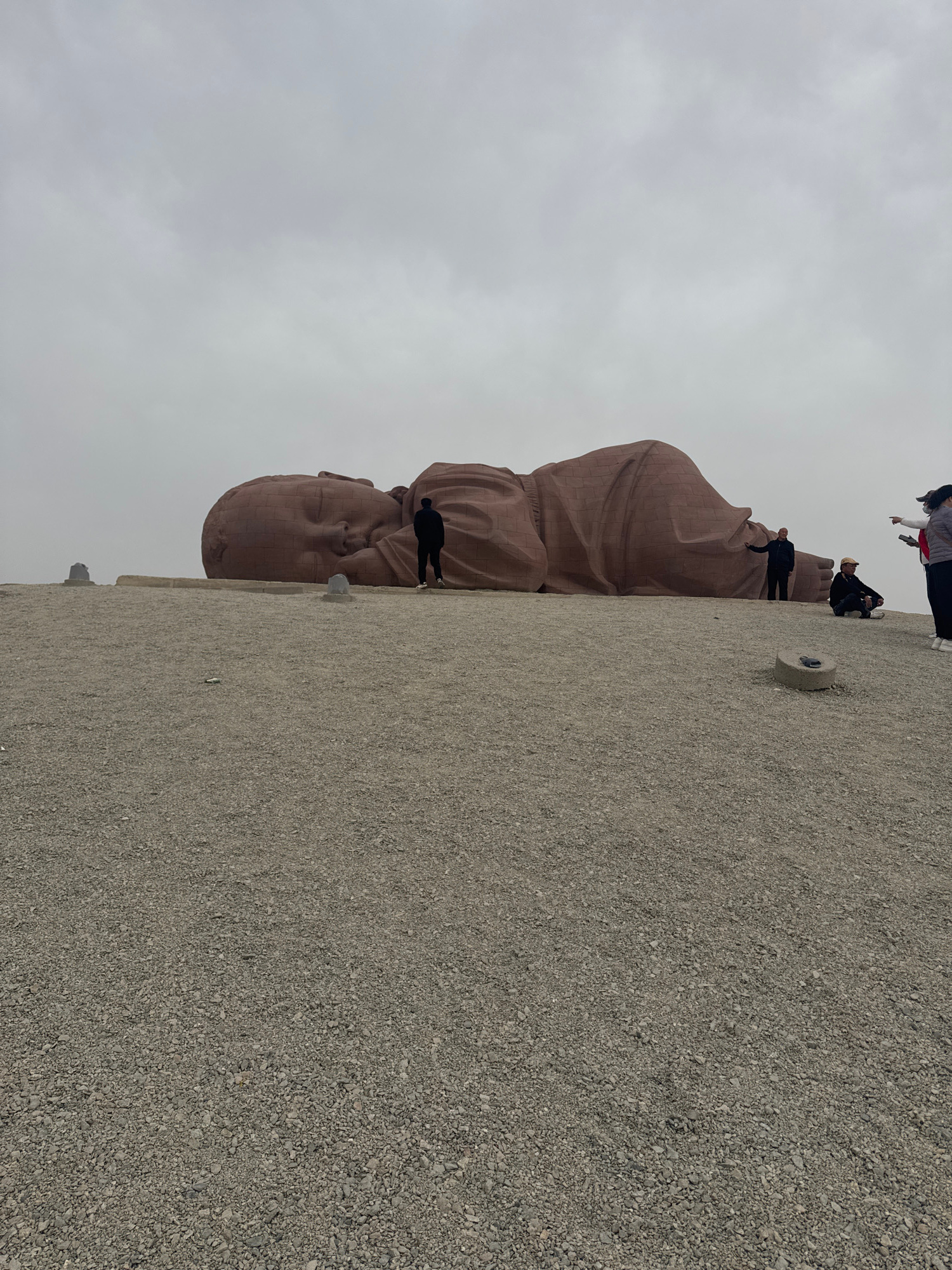 The image shows a large-scale art installation in Guazhou County, China. The installation consists of a series of large, connected, reddish-brown head sculptures laid horizontally on a gray, pebbled s…read more