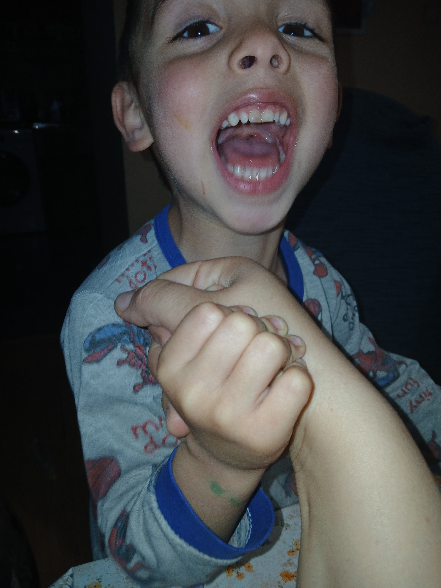 A child lies on their side, mouth open wide in what appears to be a playful or dramatic expression. They are wearing a grey pajama top with blue trim and Spiderman cartoon designs. One of their arms i…read more