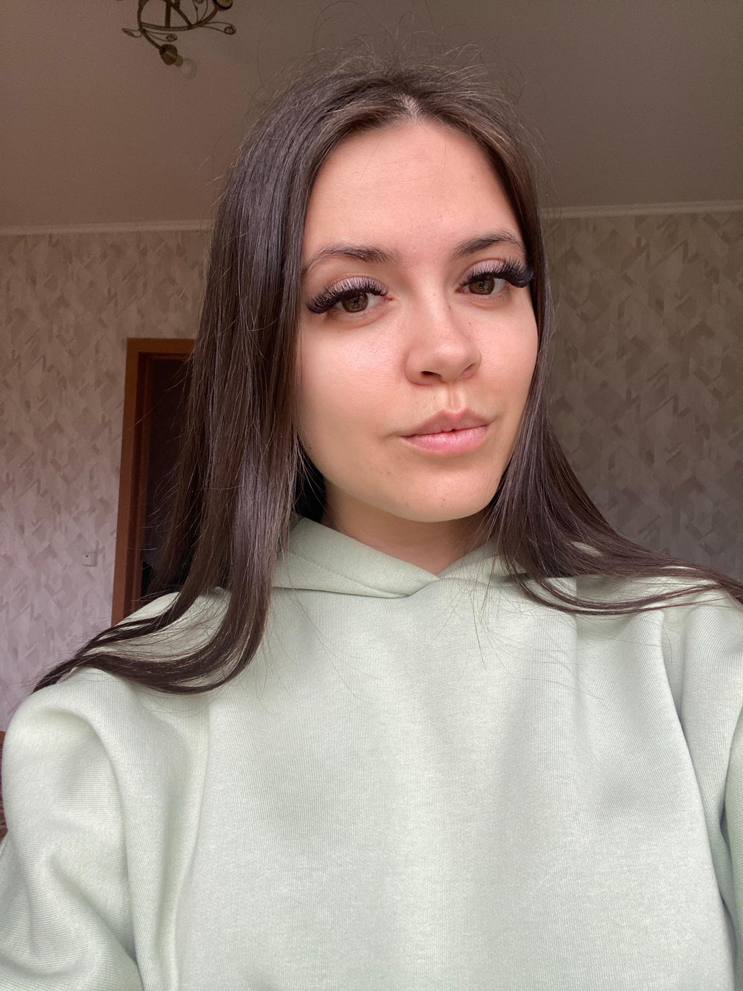A woman with long brown hair and false eyelashes is seen indoors, likely in a residential setting. She wears a light green sweatshirt. Behind her is a wall with patterned wallpaper. A framed object is…read more