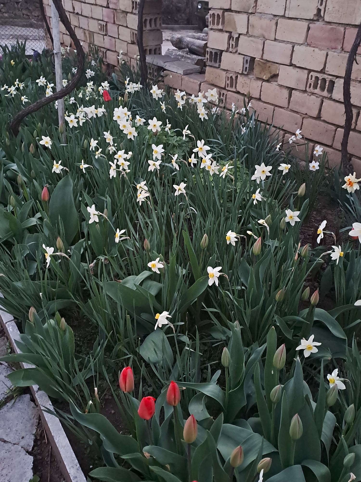 The image shows a garden bed located in Spanchevtsi, Bulgaria. The garden bed contains primarily white daffodils with yellow centers and red tulips. The tulips are in various stages of bloom, some ful…read more