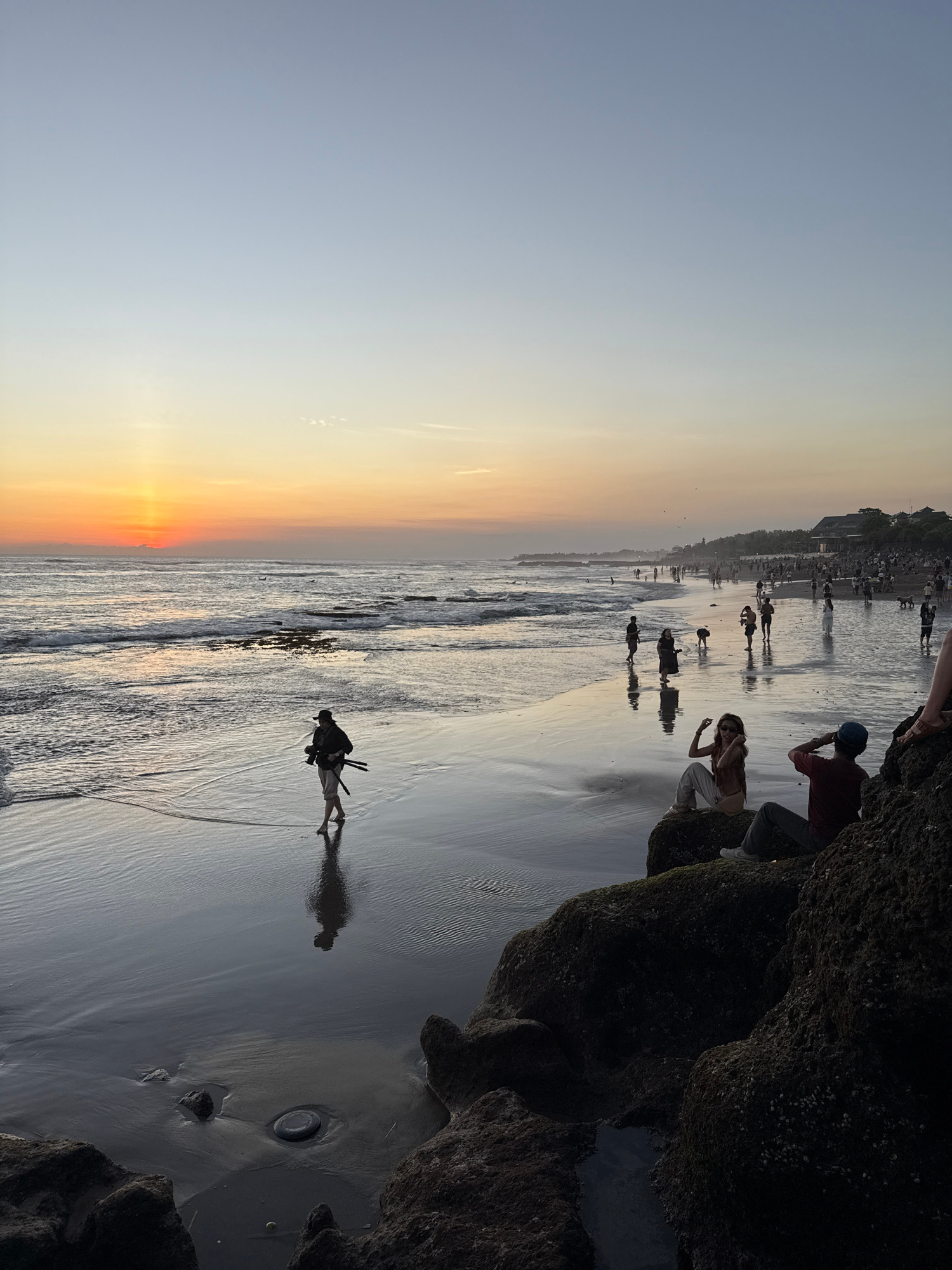 The image captures a serene sunset scene at a beach in North Kuta, Indonesia. The sun is setting on the left side of the frame, casting warm orange and yellow hues across the horizon and reflecting onβ¦read more