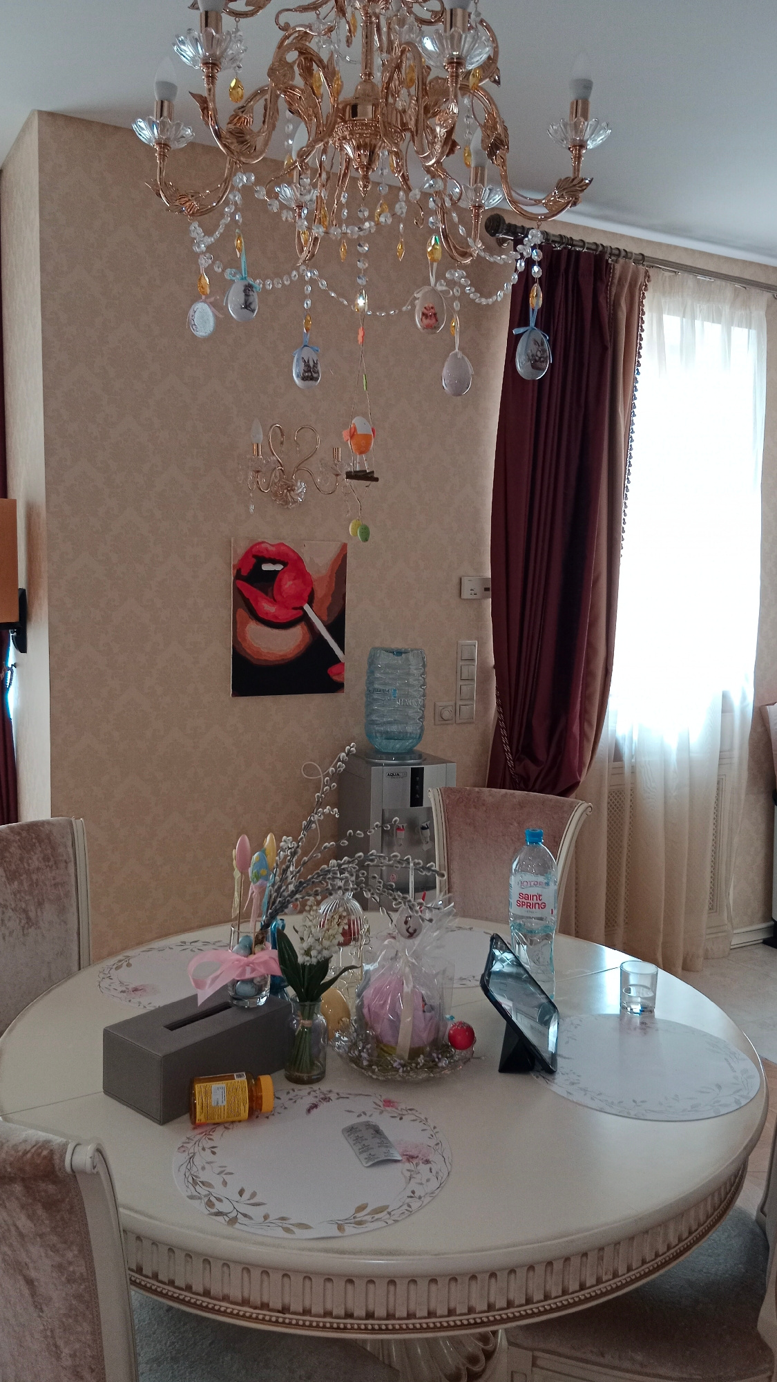 The image captures an interior scene, likely a dining room in a residential setting. Centrally placed is a round, off-white table adorned with decorative placemats. Various items are scattered on theβ¦read more