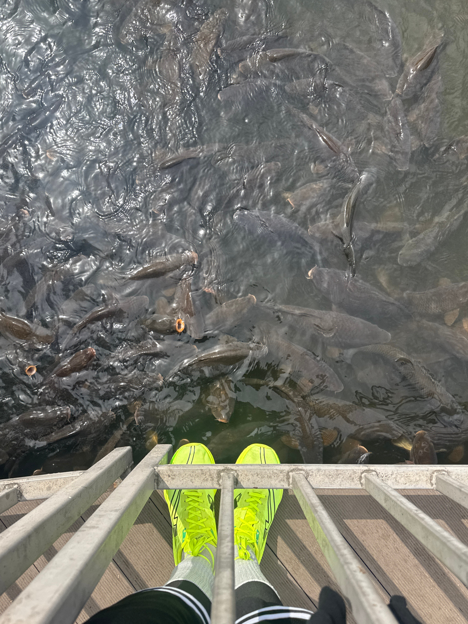 An overhead shot depicts a large group of carp swimming in dark water near a railing and a person wearing neon yellow sneakers. The location is Montana, Bulgaria, based on the presence of numerous car…read more