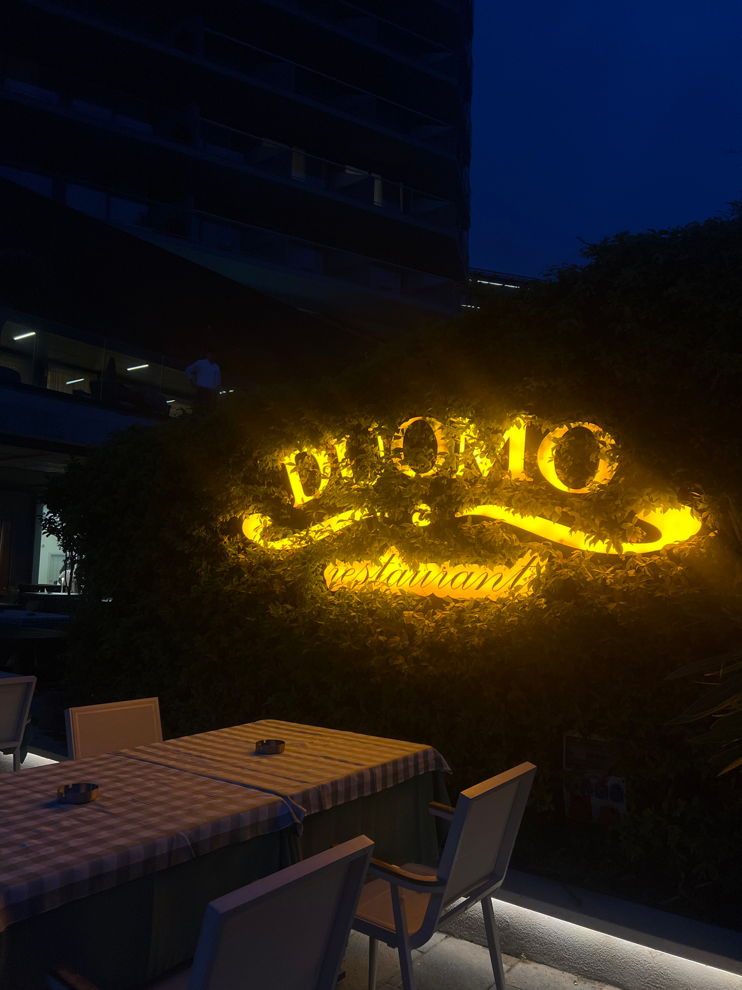 The image depicts an outdoor scene in Rafailovići, Montenegro at night. A vertically oriented, glowing neon sign that reads "Olio Restaurant" in stylized font is attached to a wall covered in lush gre…read more