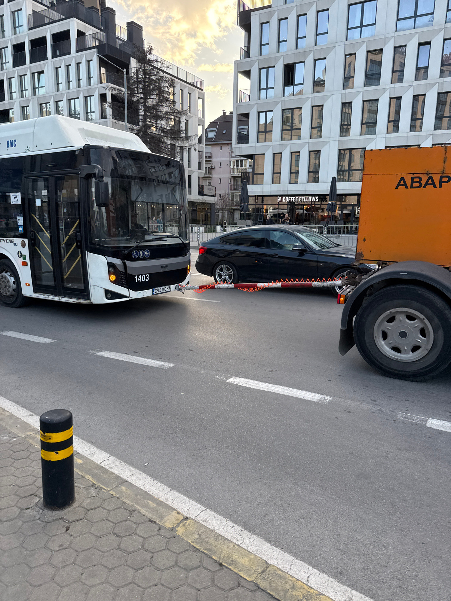 The image shows a street scene in Sofia, Bulgaria, featuring a BMC city bus numbered 1403 with license plate CB5180HA, parked on the left side of the frame. A black BMW car is partially obscured by an…read more