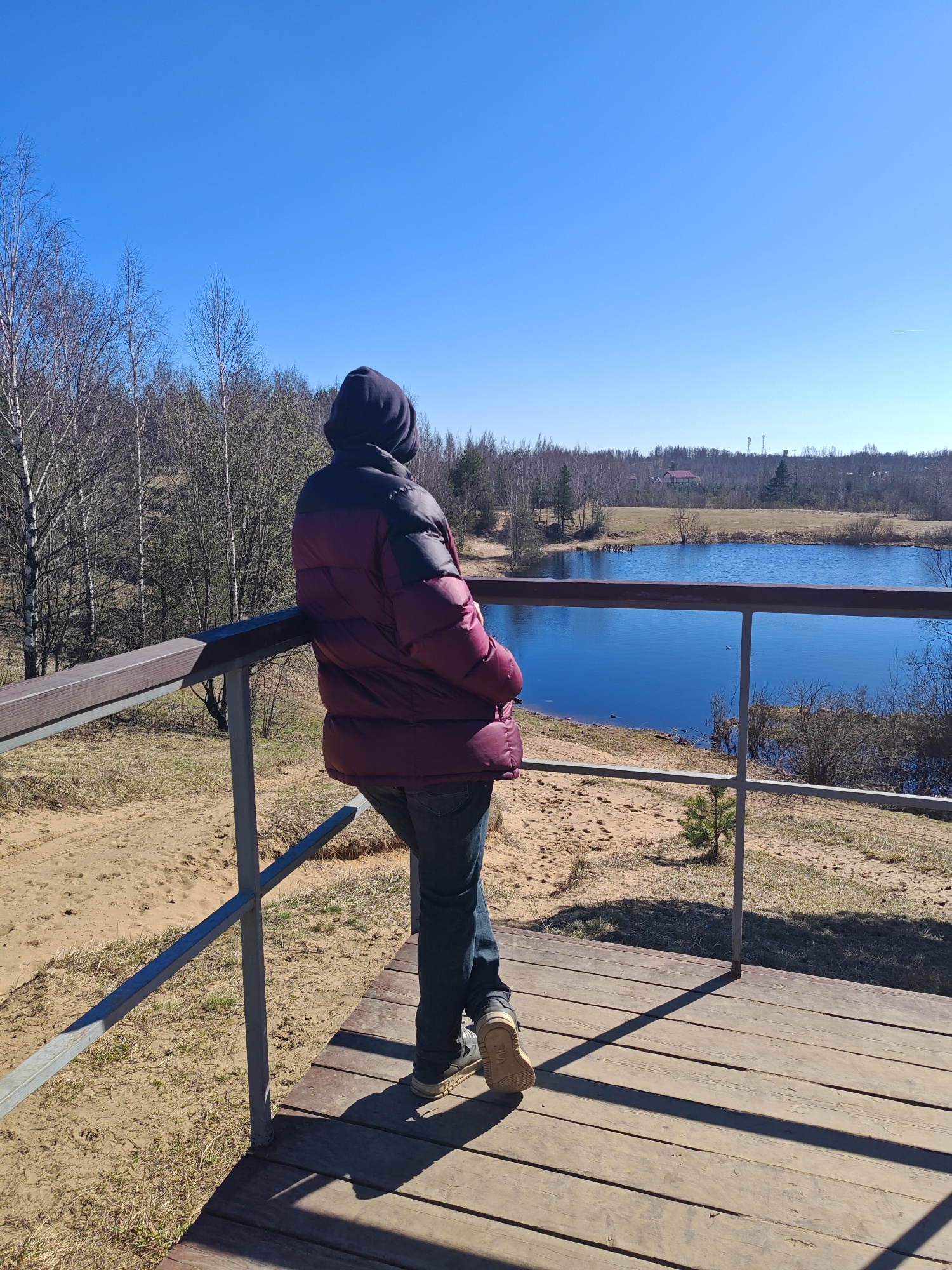 A person in a dark hood and a burgundy and black puffer jacket stands on a wooden platform, leaning against a metal railing, and looks out over a lake. The lake is surrounded by sandy terrain and a sp…read more