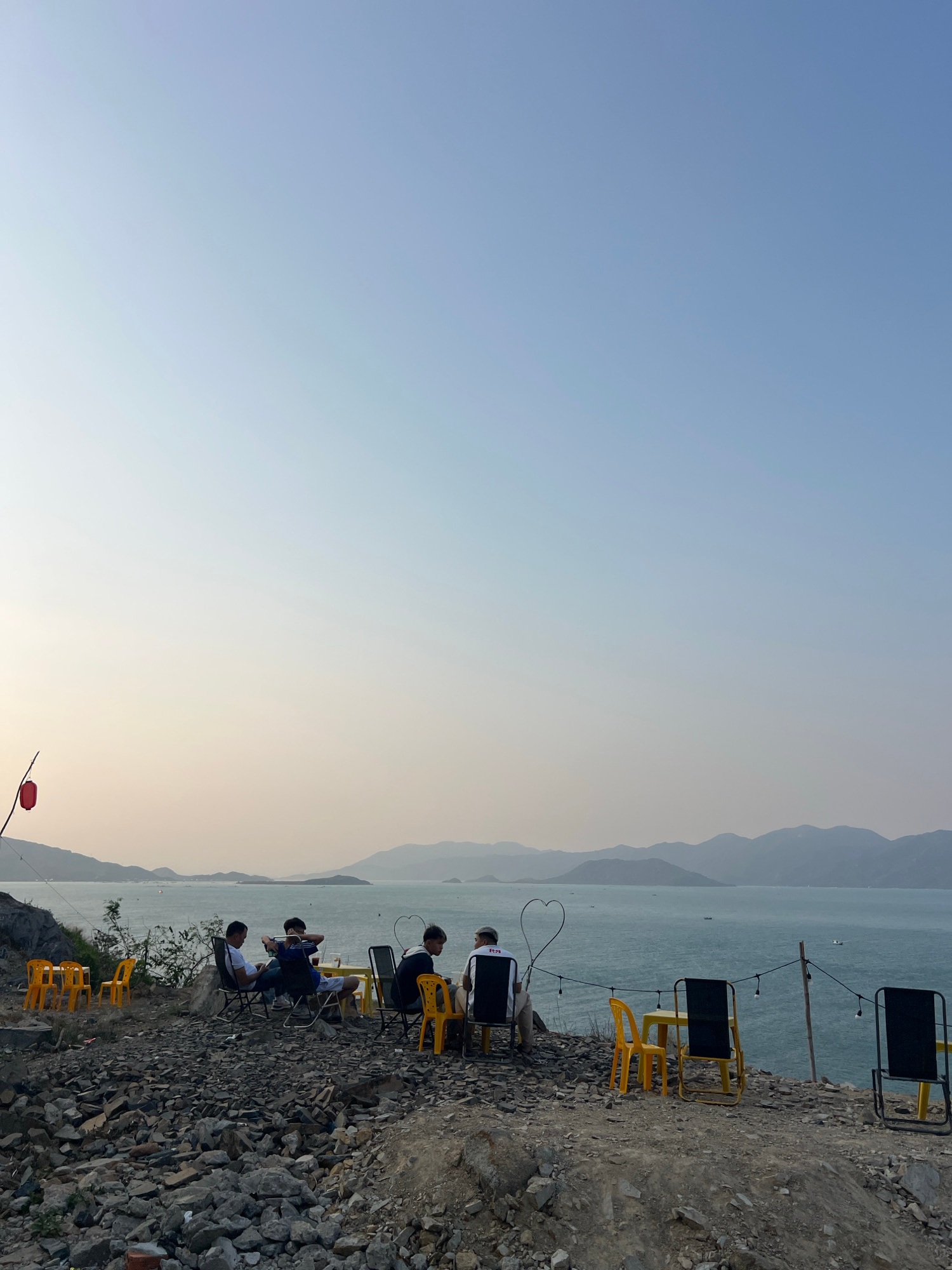 Located in the city of Bac Natural Heritage Area Trang, Vietnam, the scene is of people sitting in chairs with a view of the water and the mountains. The chairs are yellow and black, and there are fiv…read more