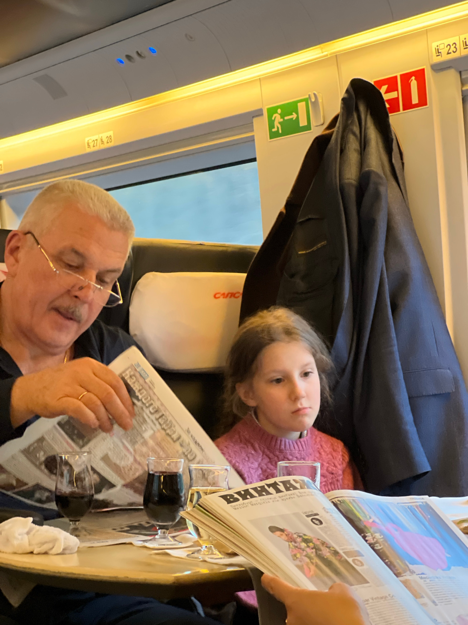 On a train, a man in glasses reads a newspaper, with a young girl next to him. A dark jacket hangs above them. Two glasses of dark liquid are on the tray table. The train interior includes overhead li…read more