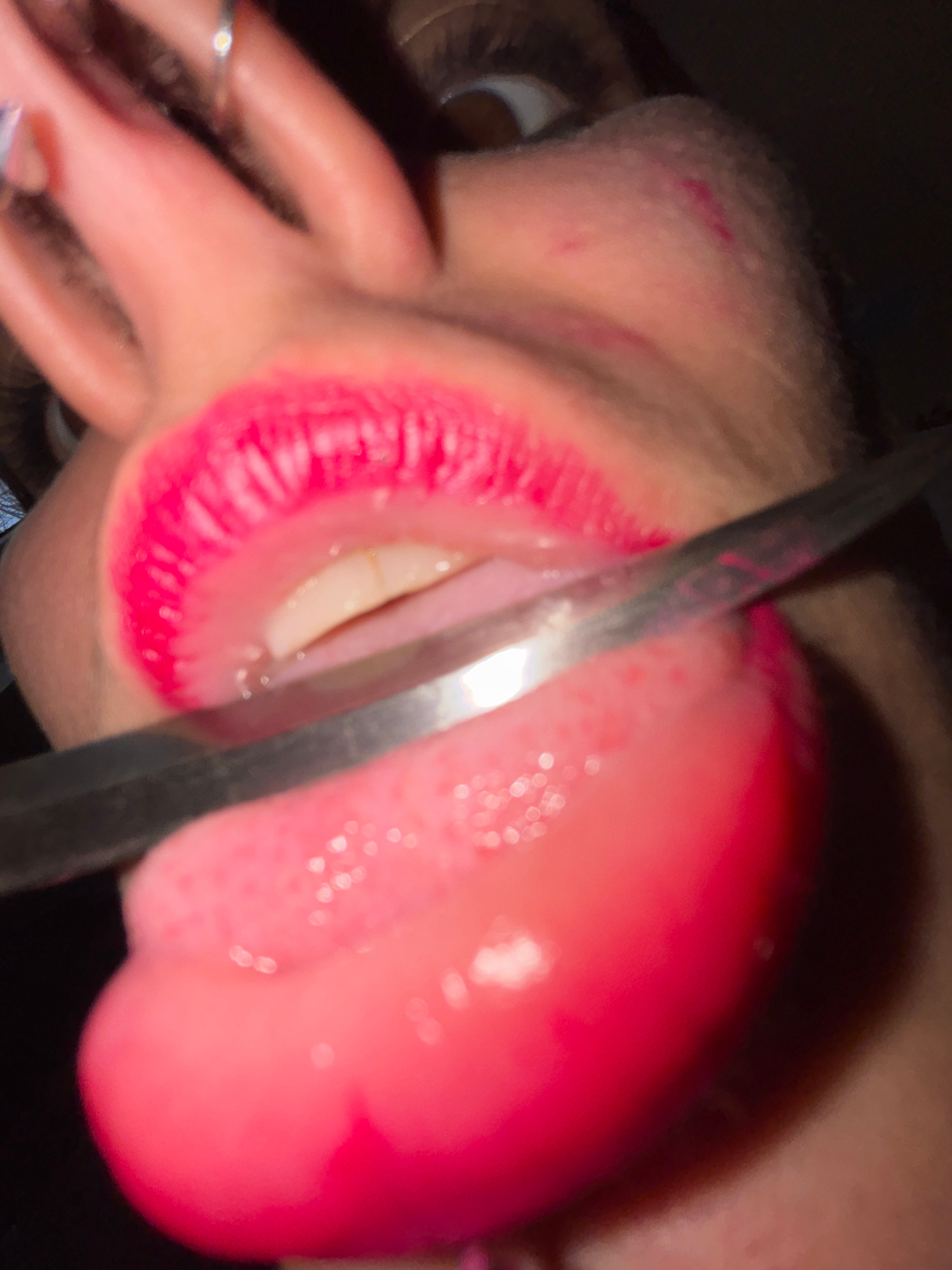 A low-angle, close-up photograph shows a person's open mouth with a silver knife placed vertically between their red-lipsticked lips and tongue. The person's hand is visible in the lower left corner.…read more