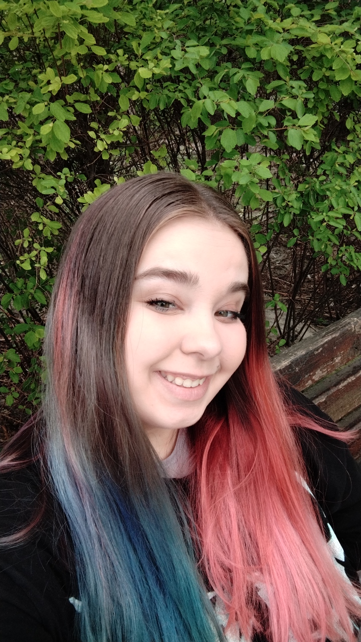 A girl smiles, crouching on a red brick sidewalk in Plovdiv, Bulgaria, while petting a calico cat. The cat is white, orange and black. The girl is wearing a black sweater with neon patterns.