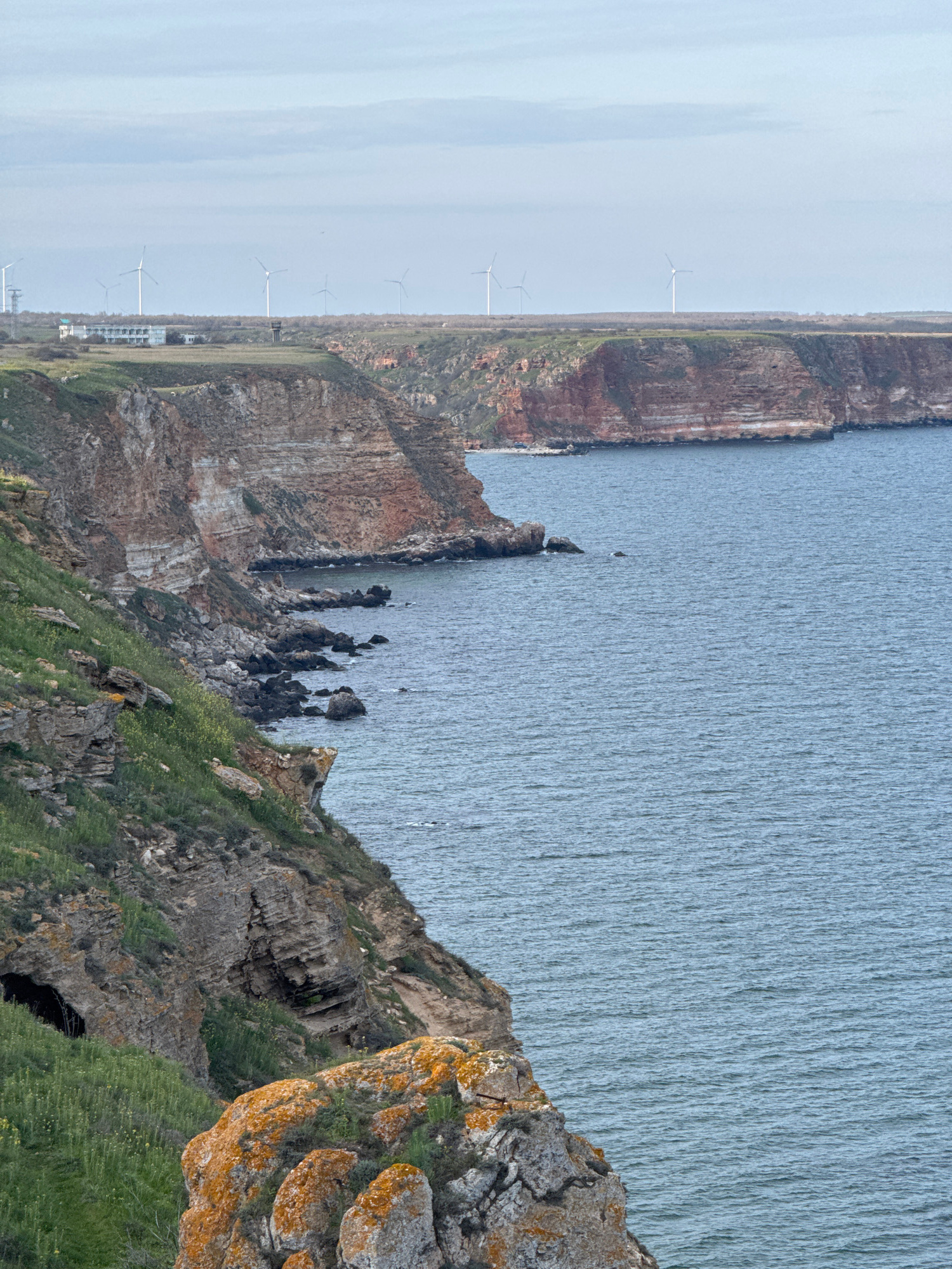 The image captures a coastal scene in Balgarevo, Bulgaria. A steep, rocky cliff plunges into the sea. The cliff is textured with layers of rock and patches of green vegetation. Lichen is visible on so…read more