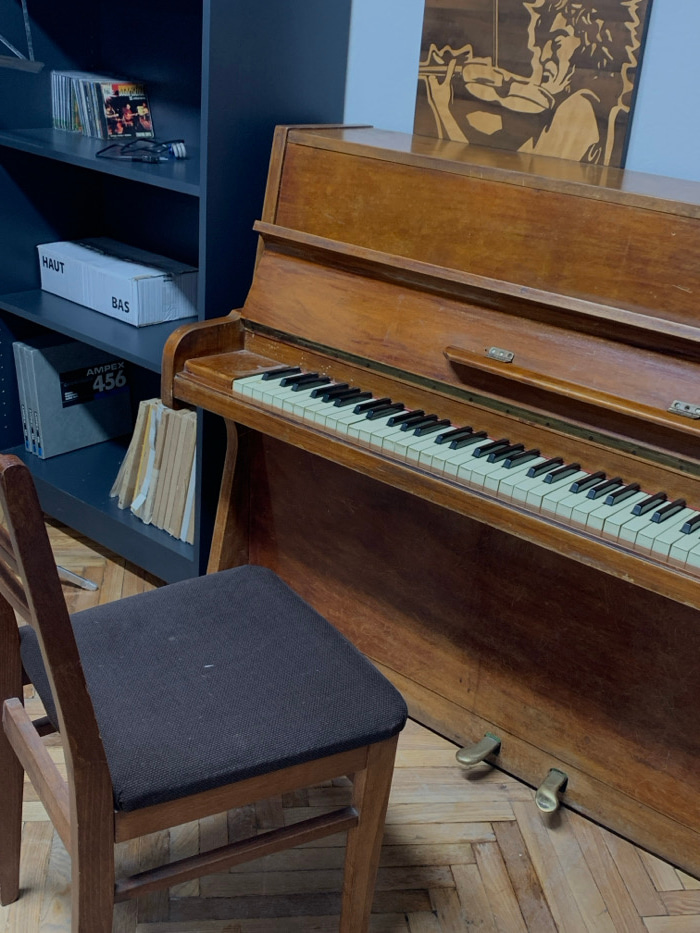 The image displays an indoor scene in the city of Kyiv, Ukraine. A vintage-style, wooden upright piano, dark amber in color, occupies the right and center of the frame. Its white and black keys show m…read more