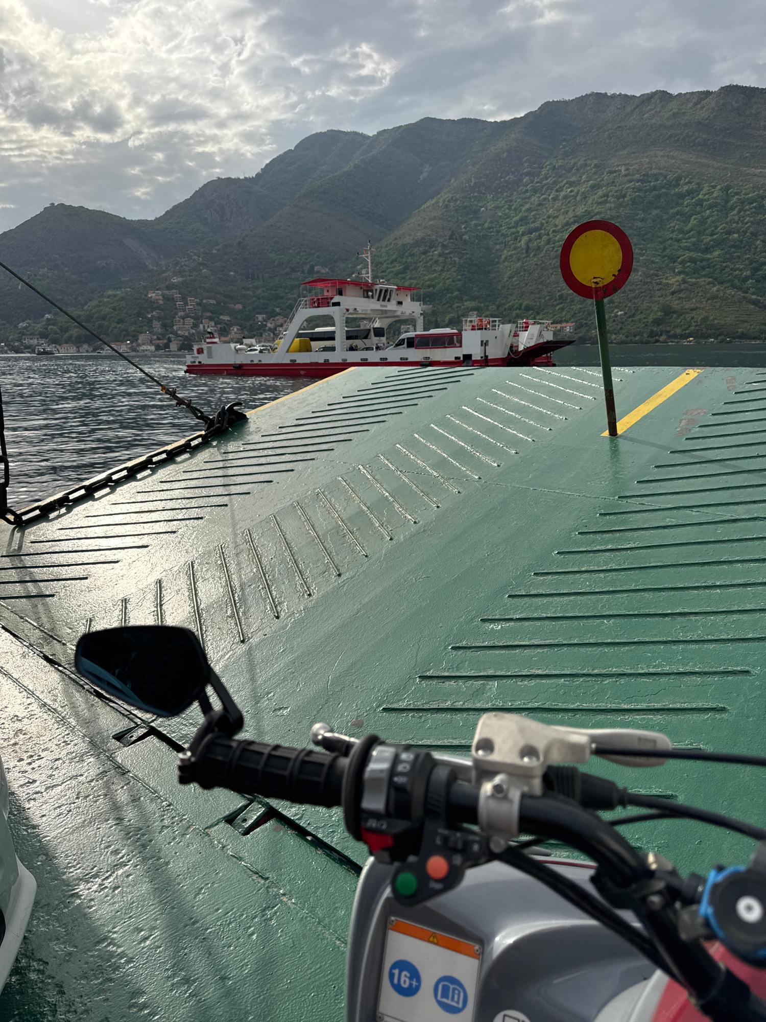 The image captures a first-person perspective from a vehicle, likely a motorcycle or scooter, parked on the green deck of a ferry. The handlebars, mirror, and control switches of the vehicle are visib…read more