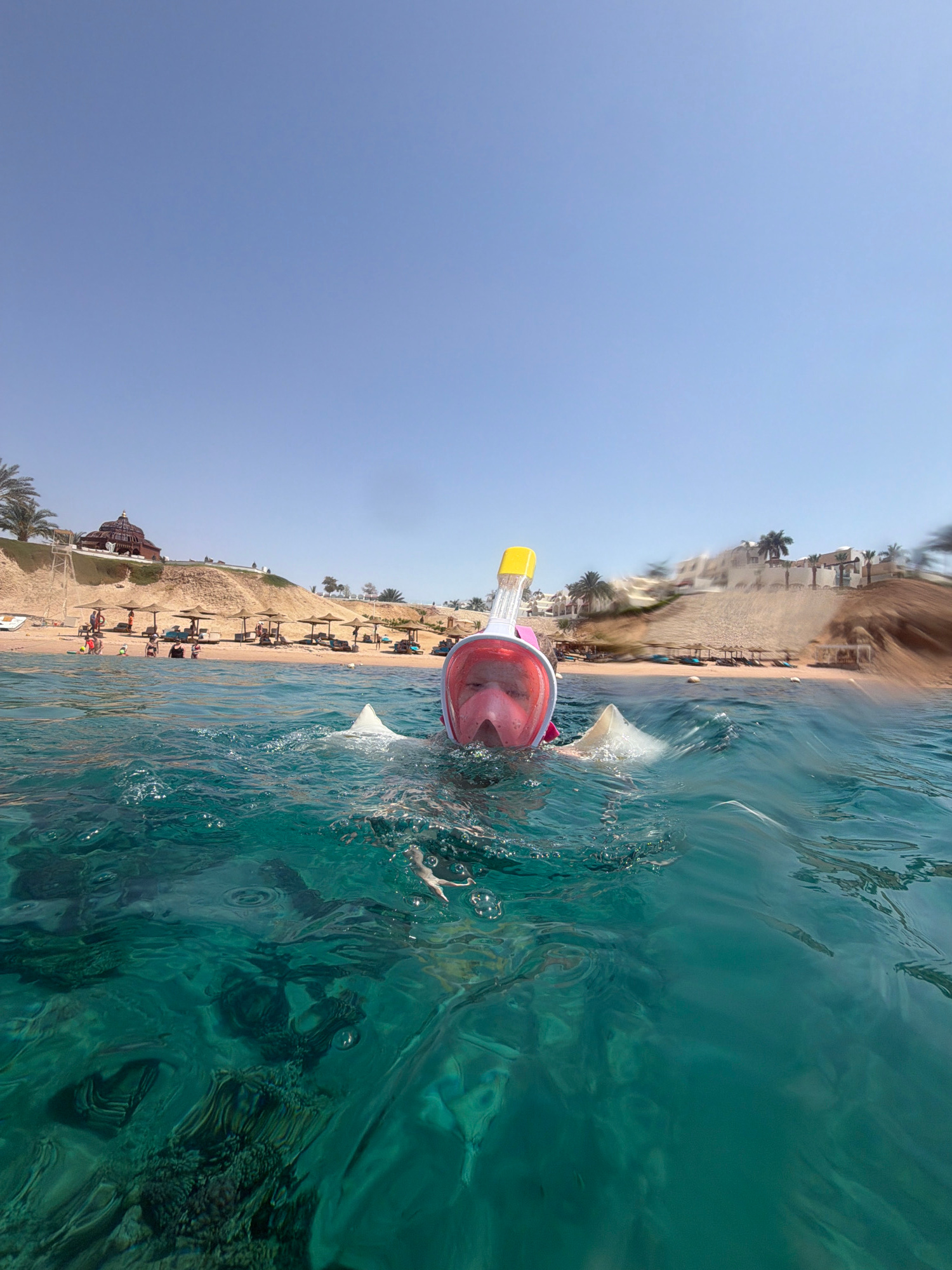 This vibrant image captures a person enjoying a snorkeling activity in clear turquoise waters, likely in Sharm El Sheikh, Egypt. The main subject is a person wearing a distinctive pink and yellow full…read more