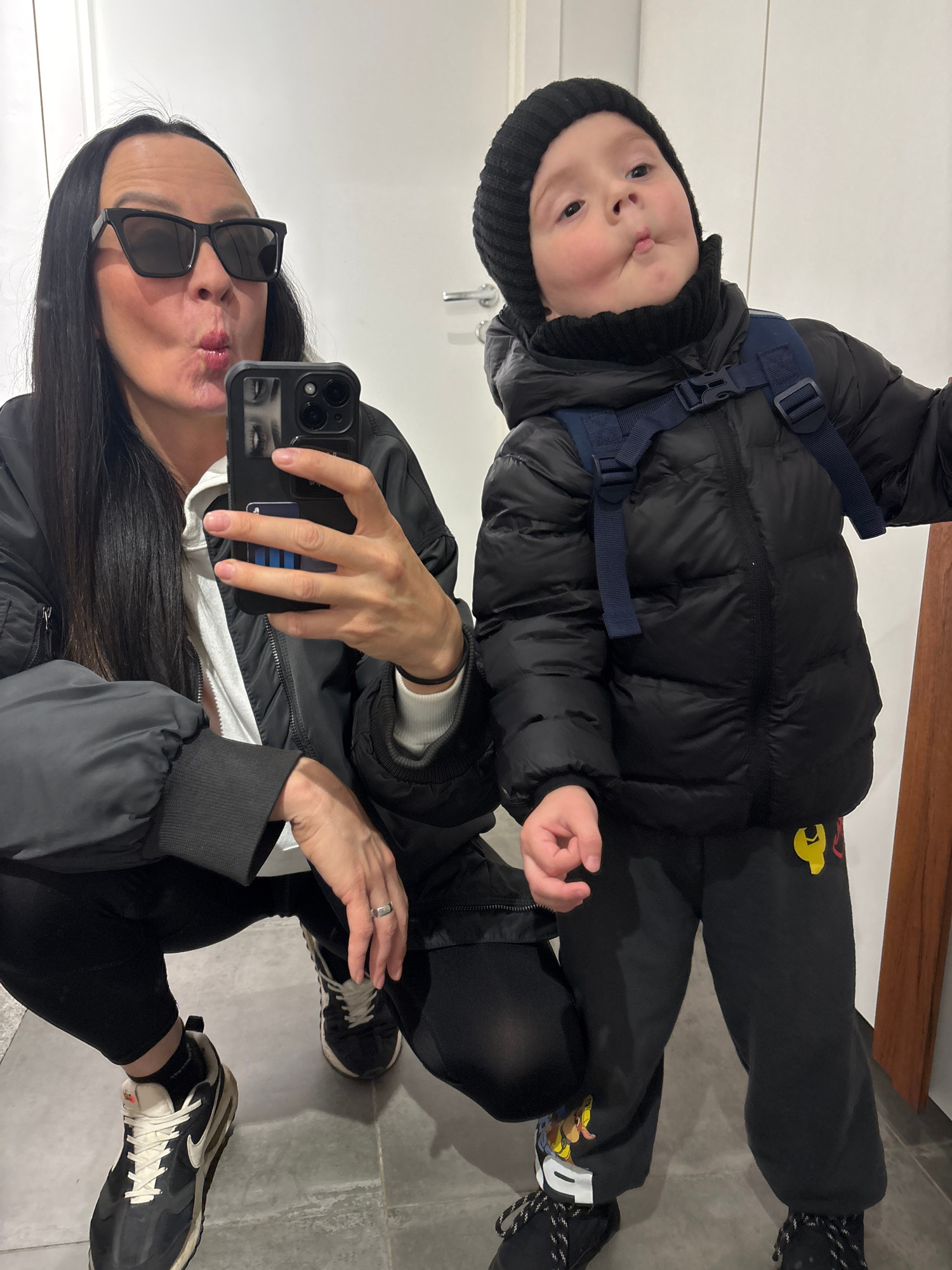 A woman takes a selfie in a mirror with a small child in Chaikovsky, Russia. The woman is wearing sunglasses and a black jacket and pants, while the child has on a black puffer jacket, black knit hat,…read more
