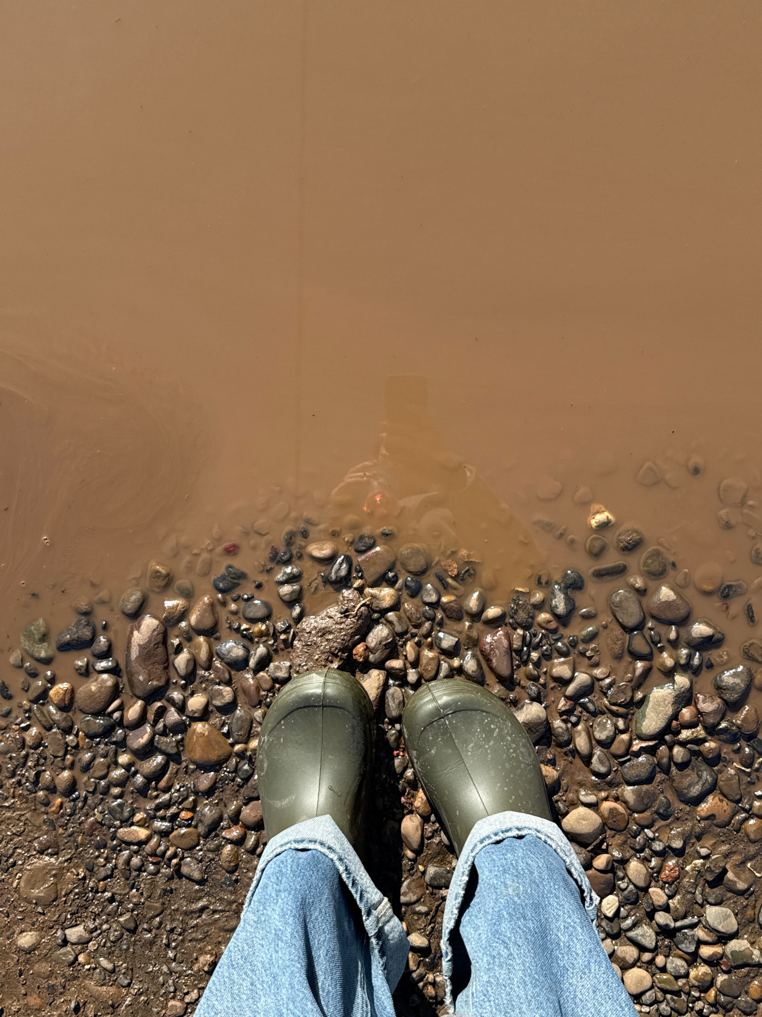 A first-person, downward-facing perspective captures the lower legs and feet of an individual standing at the edge of a muddy body of water in Elovo, Russia. The individual is wearing light blue denim…read more