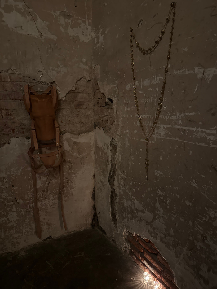 An eerie interior scene shows a dilapidated room with crumbling walls and ceiling. A string of lights hangs from the ceiling, forming a decorative pattern. Below, a vintage piece of furniture, possibl…read more