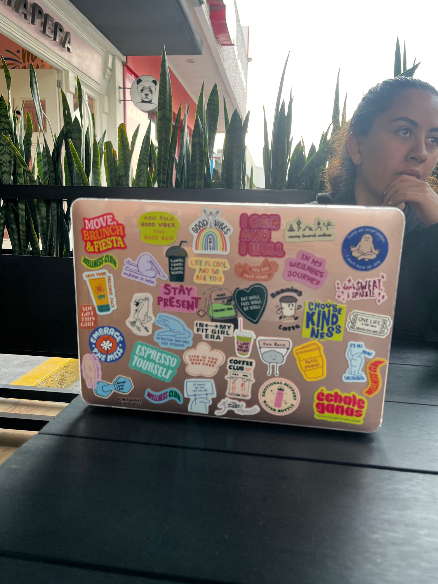 The image shows a woman looking off-camera with her hand near her face, next to a laptop covered in stickers. The laptop is on a dark surface, likely a table. Behind the laptop and the woman is a row…read more