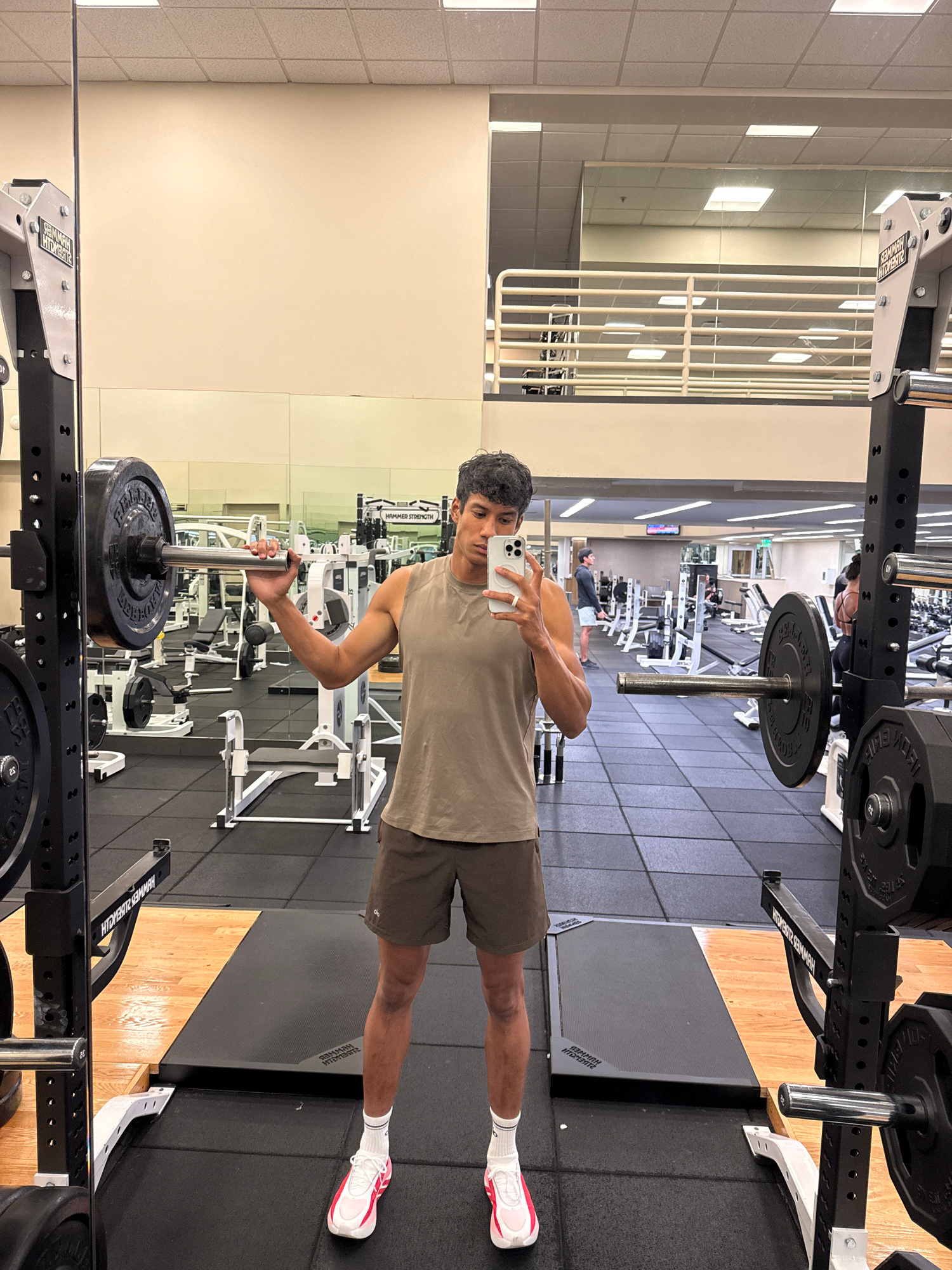 A man stands in a gym, holding a phone in his right hand and a barbell with weights in his left hand. He is wearing a light brown tank top, dark brown shorts, white socks, and white and pink athletic…read more