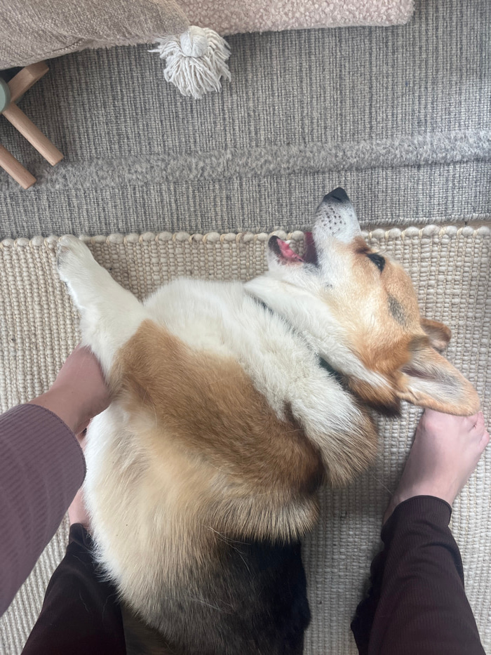 The image depicts an indoor scene in Gangloff, Germany, captured from an overhead perspective. A tricolor Corgi dog, with tan, white, and dark brown fur, lies on its back across two layered rugs. The…read more
