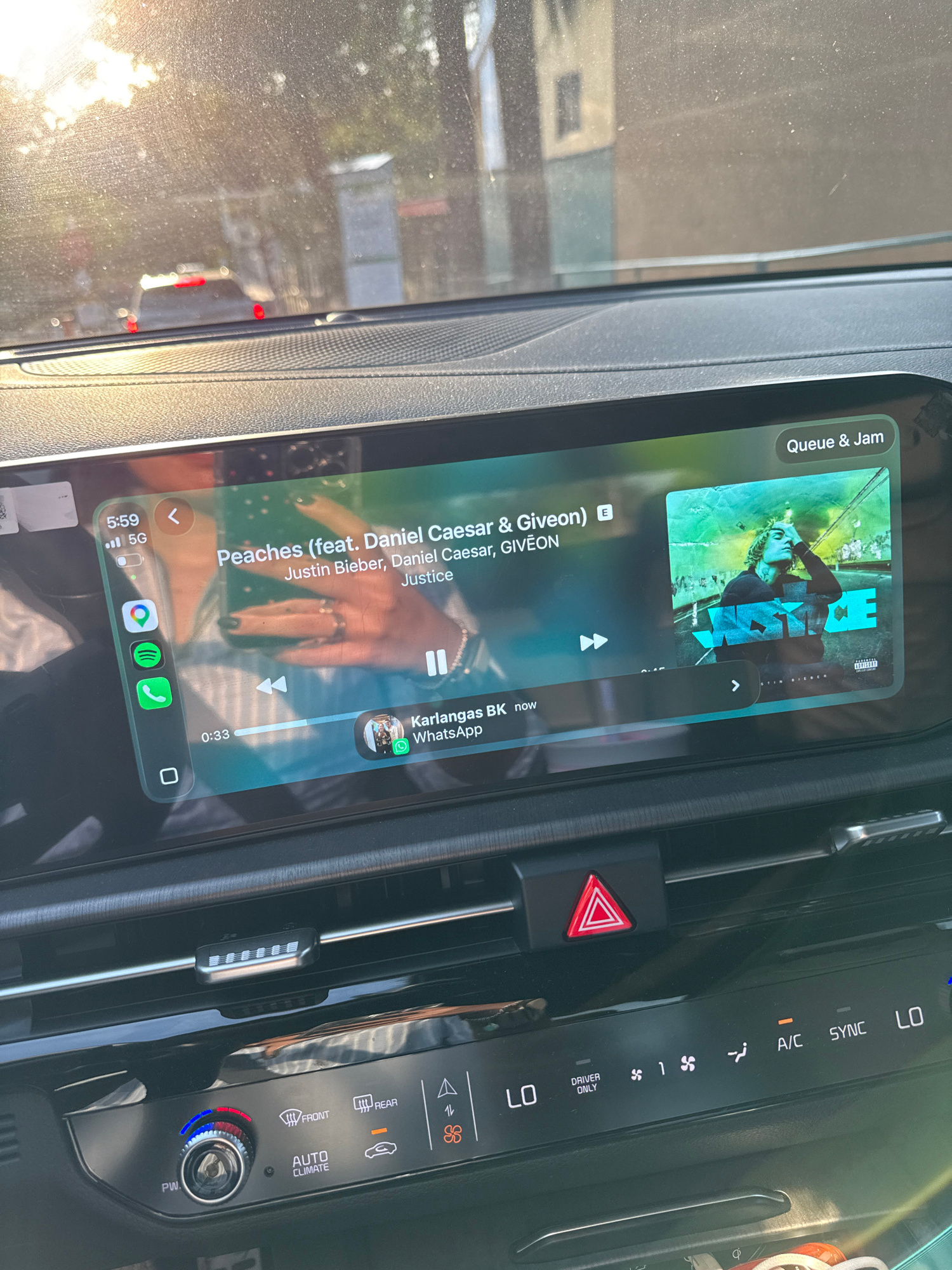 The image shows the interior of a car. The infotainment screen displays the song "Peaches" by Justin Bieber featuring Daniel Caesar & Giveon, playing on Spotify. There is a WhatsApp notification from…read more