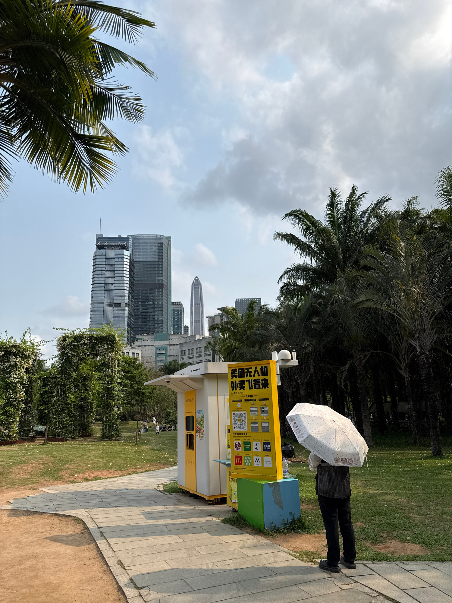 Here is a description of the image: The image depicts a scene in Futian District, Shenzhen, China. In the foreground, there is a yellow and white vending machine with Chinese writing and QR codes. A…read more