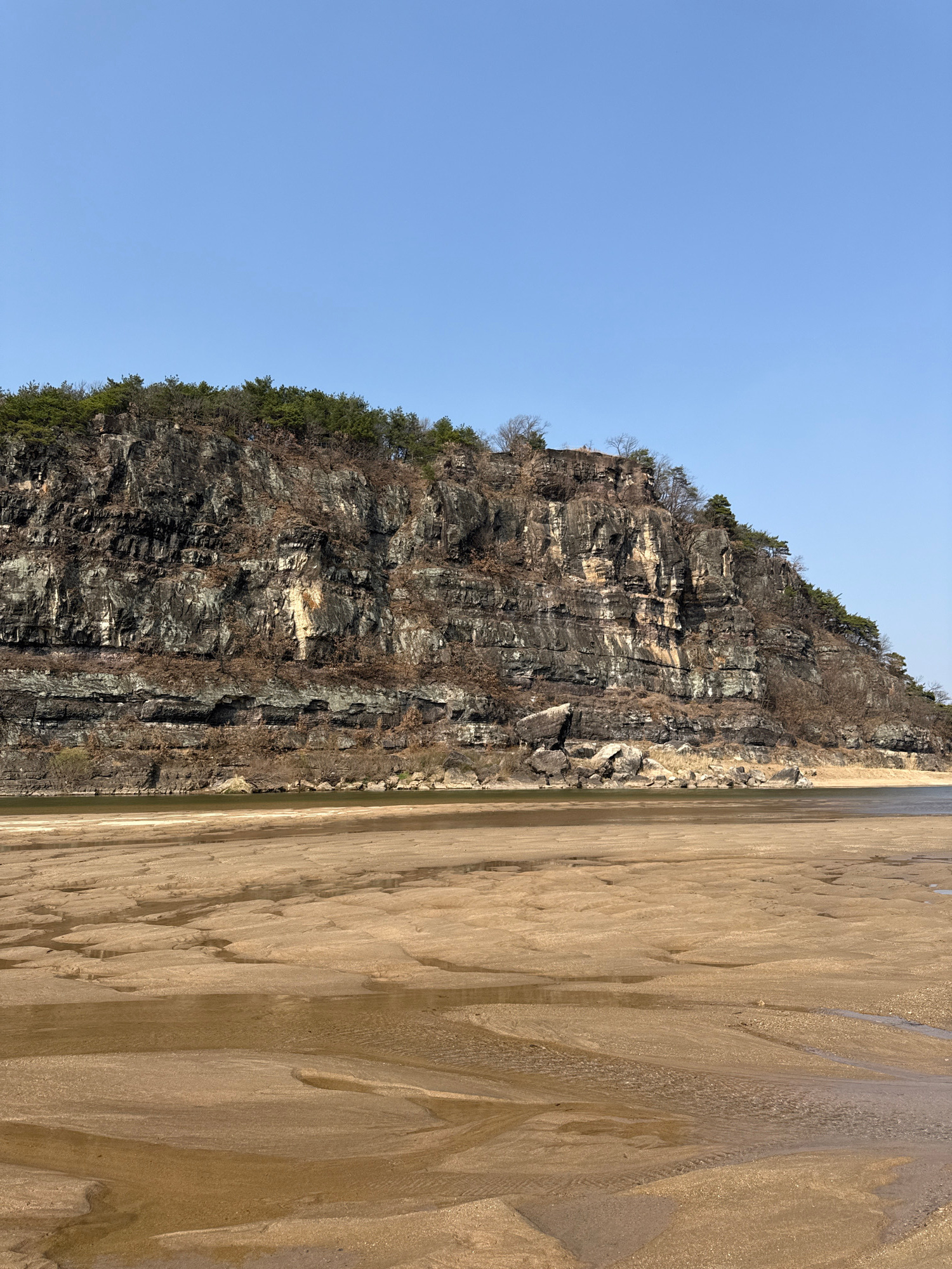 The image depicts a panoramic view of a natural landscape in Andong-si, South Korea, likely the Buyongdae Cliff area along the Nakdong River. The scene is dominated by a clear, light blue sky occupyin…read more