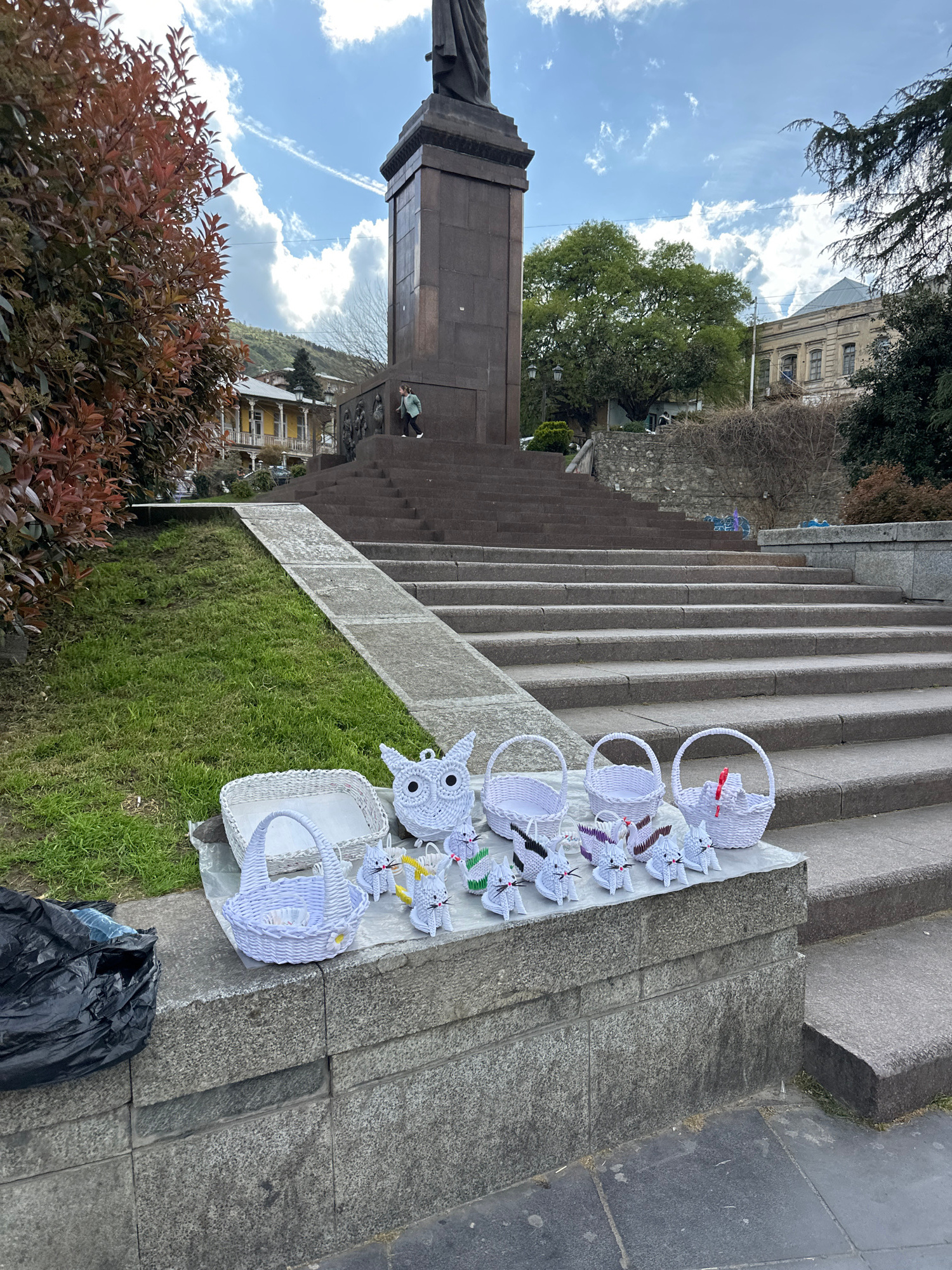 The image shows a vendor selling woven baskets and origami birds on the steps of a monument in Tbilisi, Georgia. The baskets and origami are white, with some color accents. The monument is made of bro…read more