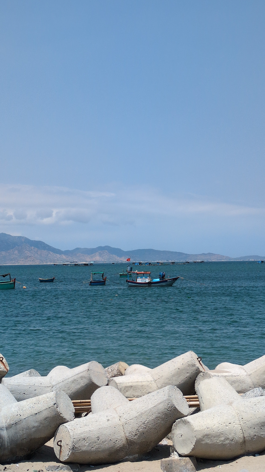 The image shows a seascape in Phan Rang – Tháp Chàm, Vietnam, with concrete tetrapods forming a breakwater on the right side. Boats are floating in the water. Mountains are visible in the distance, an…read more