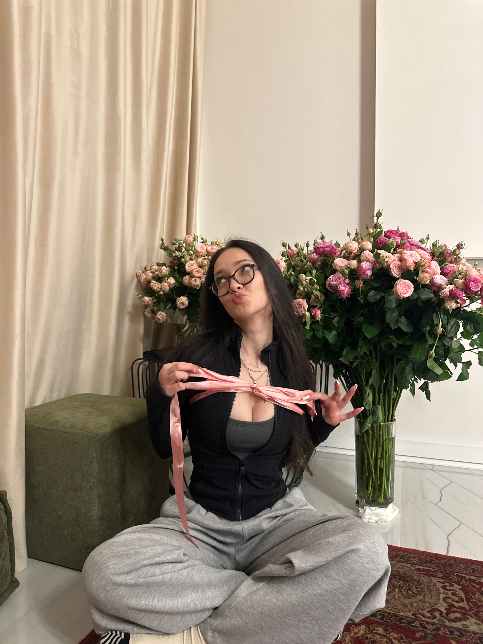 The image captures a young woman posing playfully in an indoor setting, surrounded by a large bouquet of flowers. The photograph is oriented vertically, with the woman positioned on the right side of…read more